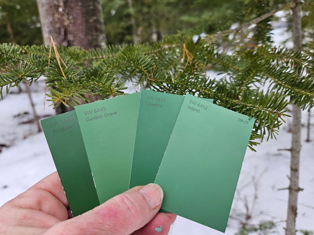Retreating to more muted colors, I settled on a deep green called Basil on the north wall and a lighter version called Magnolia on the other. (This is a mish-mash of samples here, not what the walls will look like when done.) In the daylight, both draw the eye outside. Yep! I also compared Sherwin Williams to Benjamin Moore and learned about flat, matte, satin, and semi-gloss. See that plank sitting on the windowsill of the right-hand window? That’s knotty pine (which will soon cover the ceiling) with seven stain choices on it. The Sherwin Williams store did that for me, since I’ll also need to choose the stain for the wood surrounding the windowpane (sash) and the trim that will surround the window itself (casing). You see how complicated “DIY” can get. A contractor would be making suggestions for my reaction and refinement; I’m starting from scratch.