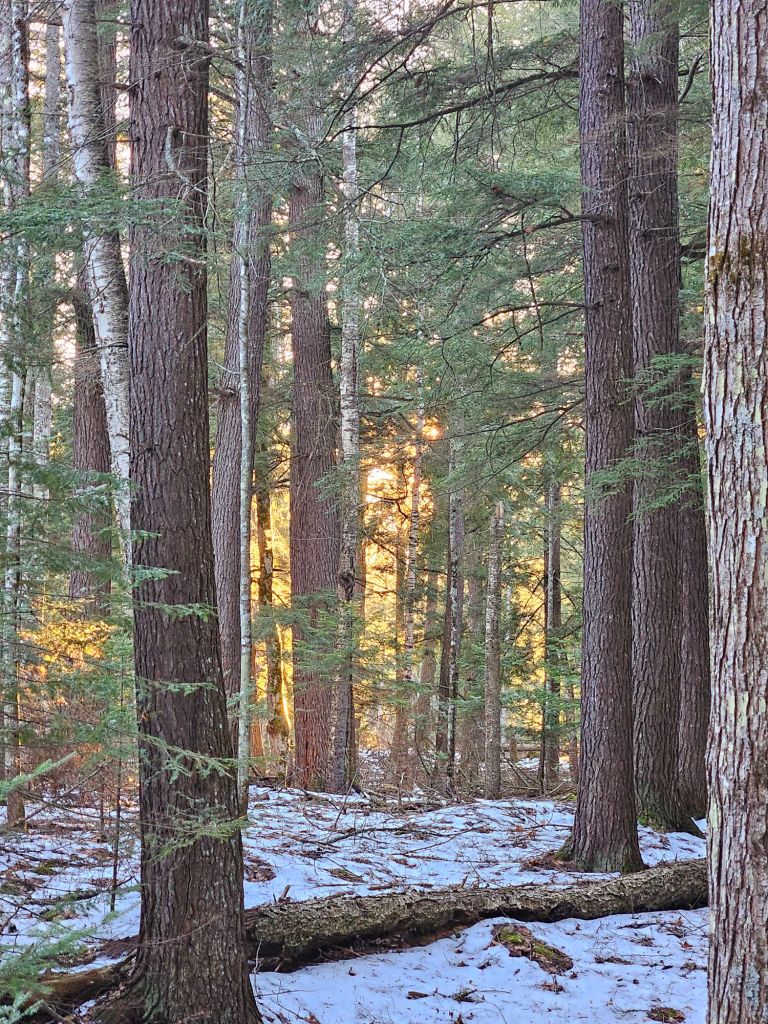 With attention on the house, I haven’t been out in nature as often as usual. The weather hasn’t been inviting either — mostly gray and icy. I finally took a walk through the woods yesterday. The snow is thin for February! Yet still beautiful, especially at sunset.