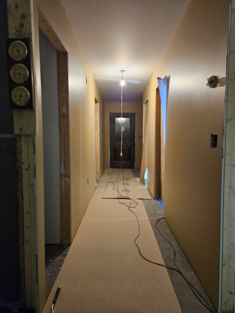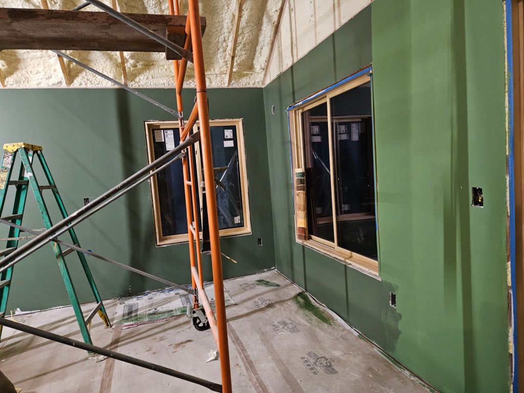 The hallway. Brown?? Yup. Actually, this is called Latte. (Jeff calls it “cardboard,” which is laying on the floor to protect the concrete, and it does look pretty close to that!) I settled on this after buying four quarts of even-darker browns as I try to create a warmth and coziness that mimics colors of nature. It’s hard to tell the final effect with only bright-white construction lights on it, but that’s what we have for now. (Buying samples to actually put on the walls, vs. the tiny squares you get in a paint store, is essential to the process. I repainted a few rooms in my Virginia home, where I learned that key step.) Jeff is doing all the painting so far, though I want to get into it. I’ve been helping sand the drywall to remove imperfections and playing with colors for the bedroom.