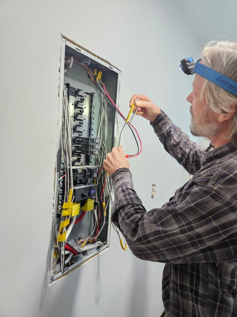 Jeff continues to educate himself on the intricacies of electrical work. Even though I grew up with it (since it was “the family business”), it remains a mystery to me. We’re both grateful my brother came last fall to give us a big boost here, but Jeff has to figure out the rest of it. Good thing my brother labeled things in this electrical panel, which I call “the nerve center” of the house.
