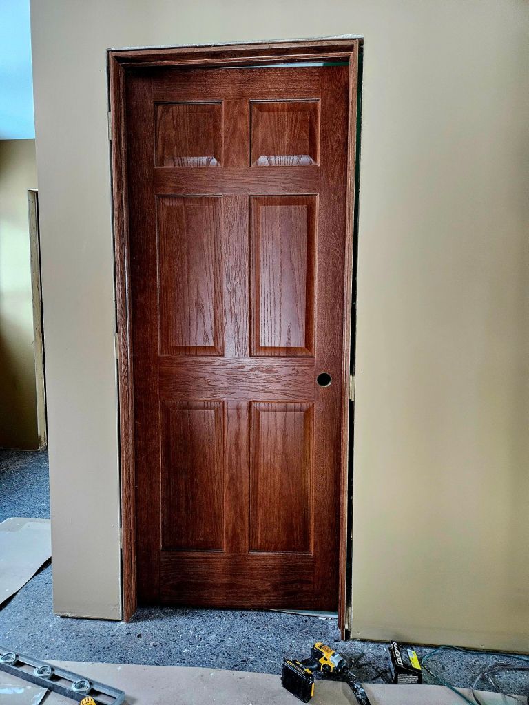 Here’s the same door, with the trim added. Trim type and color is another choice that I’ve never thought about before. This one was easy. I got the pre-packaged trim that matches the door and was in stock. (It was also pre-stained. I’m still staining window and patio door sashes, and it’s tricky.) The window trim will take more thought.