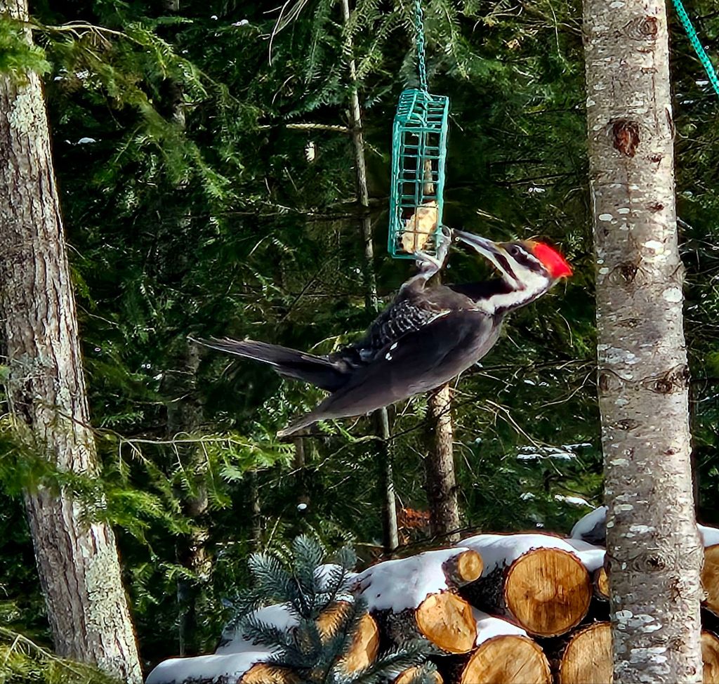 Speaking of strange. How does this ginormous pileated woodpecker manage to hang onto the suet holder? We hung it right in front of the cabin a few weeks ago to entertain us during work breaks. It took a long time for the little birds to find it. And then this guy did. I get mad at him for hogging the feeder and chasing the chickadees away, but he is beautiful.