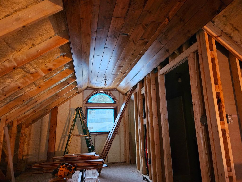 Day 1 of ceiling installation began in the middle. Already, the upstairs began to look like a cabin loft, but wait until….