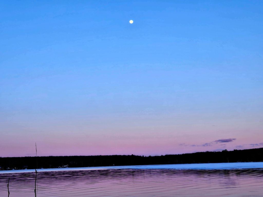 The post-sunset view through the east patio door after I removed the plastic from it. It’s been cold for a week or more, highs in the 20s, so the ice is trying to come back. Jeff is hankerin’ to put the dock in the water. I say, “wait a bit.” We could still get more winter!