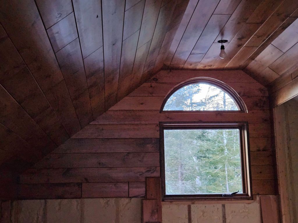 The east wall looks great. (Wish I remembered to remove the blue tape from those triangle windows. Back up on the scaffold soon!) See two bare bulbs in this photo, and two places for lights on the wood wall below the windows? I’ve ordered two kinds of rustic sconces to try on the green wall and am still thinking about sconces for the wood wall. I might get an antler chandelier to hang from that ceiling (over the dining table). Too much, maybe? We’re also trying to figure out the right trim for the windows and doors. Jeff thinks the leftover knotty pine might work. I’m not sure, since there’s so much variability in it. Would it work as well for trim as for the ceiling? I’m thinking oak, stained to match the window sashes. But I also need to lighten up things a bit. Your thoughts on lighting and trim welcome…