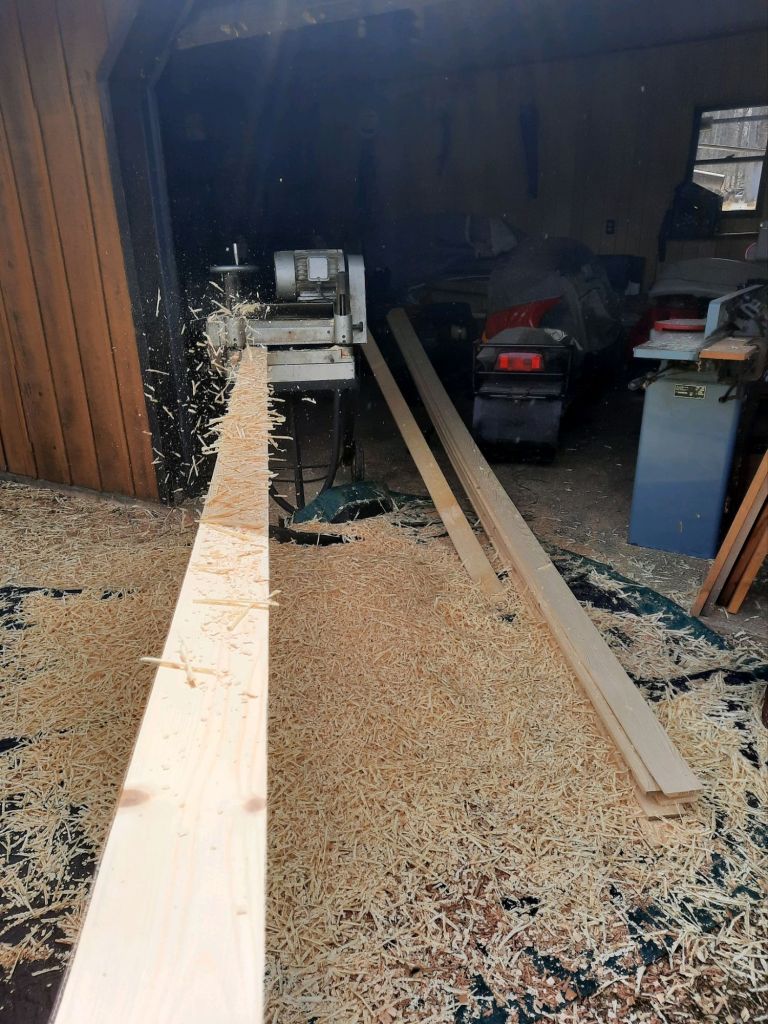 To trim the gable-end windows, Jeff bought some unfinished pine and “planed” it (made it more thin) on his sawmill. That’s about $30 in shavings and sawdust there!