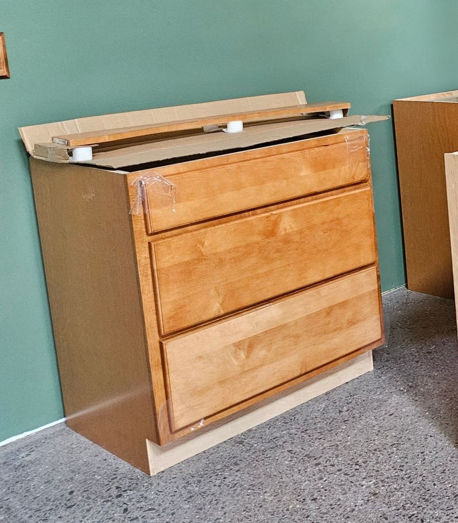 I reported a faulty drawer-front (see bottom drawer of this piece) and expect a replacement. When a major delivery arrives, it’s tempting to feel relief that it’s finally here…but the job isn’t done until it’s inspected and then installed.