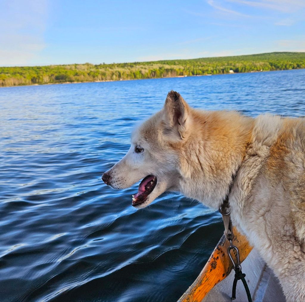A time-out with Roscoe in the rowboat helps de-stress. At age 14, he’s already outlived a Huskey’s life expectancy but still prances in joy occasionally and enjoys our outings.