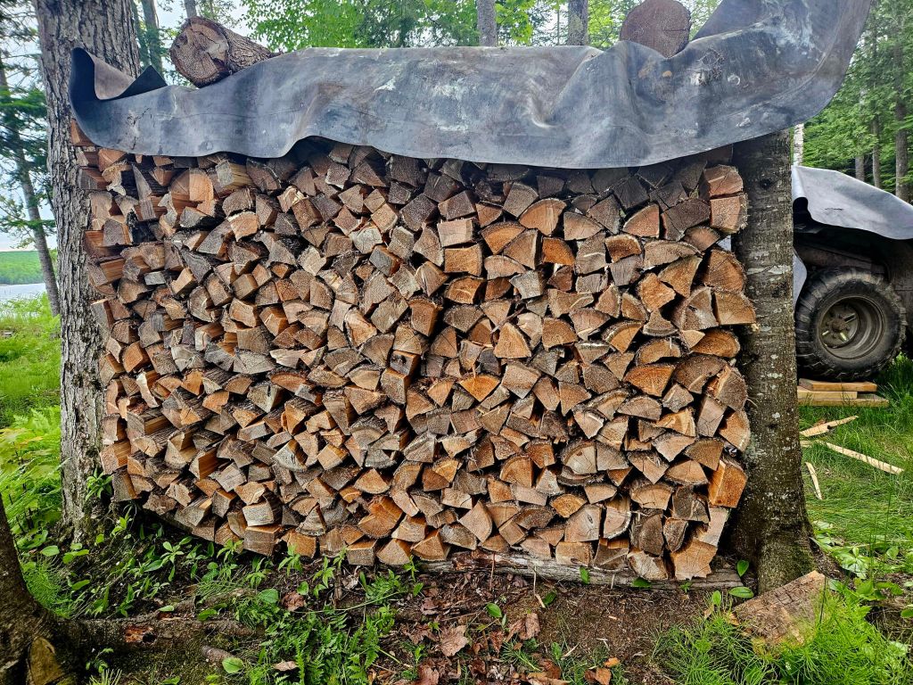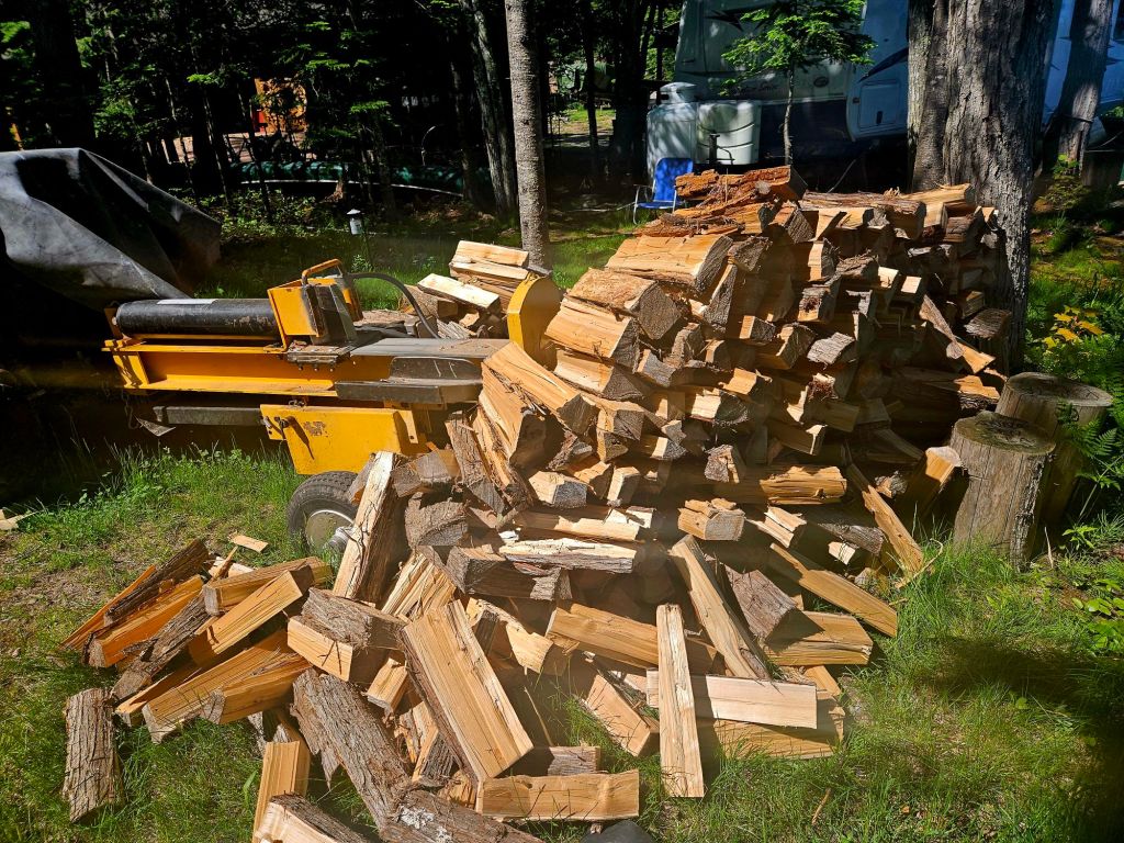 Wood piles are a constant around here, and this weekend, I split a huge pile of cedar stumps into kindling and then re-piled it while Jeff worked with the gravel. I’m so grateful for Jeff’s wood splitter, but it doesn’t prevent a sore back. We have years’ worth of wood to burn, from trees we took down right here. This two-acre parcel was densely wooded when I bought it.