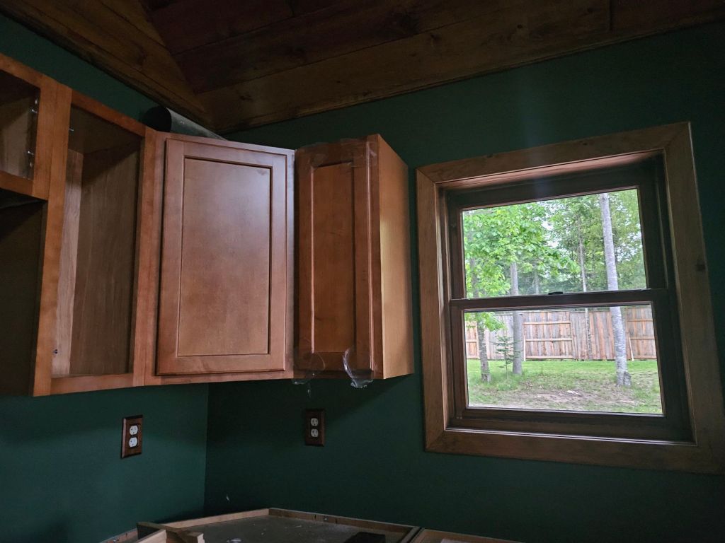 While I’m doing my outdoor thing, Jeff continues to install the kitchen cabinets. It’s tricky to fit all the pieces exactly where they need to go and make them perfectly level. I will enjoy choosing the backsplash to complement the cabinets above and the quartz countertop (on order) below. Notice our fence outside the window. Jeff and I installed that ourselves almost two years ago to create a rustic-looking barrier between our septic field and the neighbors.’