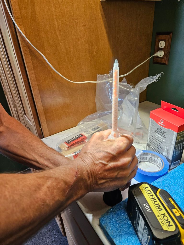 …Jeff figured how to use the squeeze-tube two-part epoxy that goes into the countertop seam.