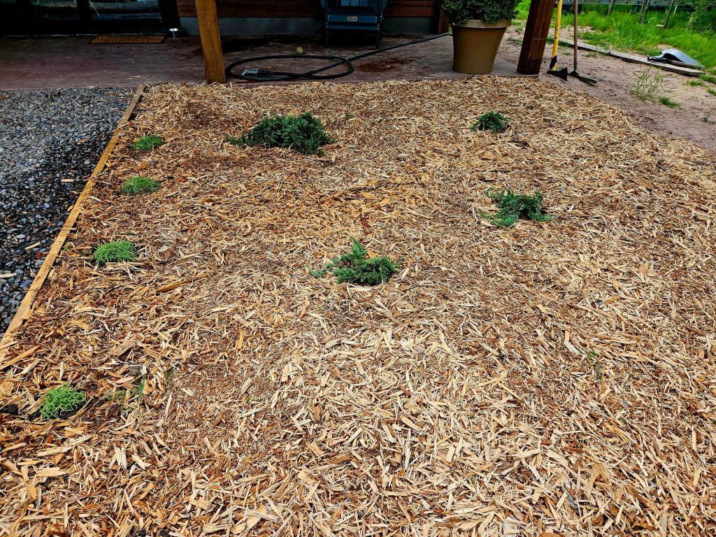 They don’t look like much now, but the juniper should spread at least six feet and the sedum (on border) will spread a foot. It’ll be hard to be patient!