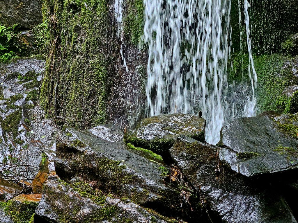 The recent rain accentuated the moss and rocks alongside this waterfall.