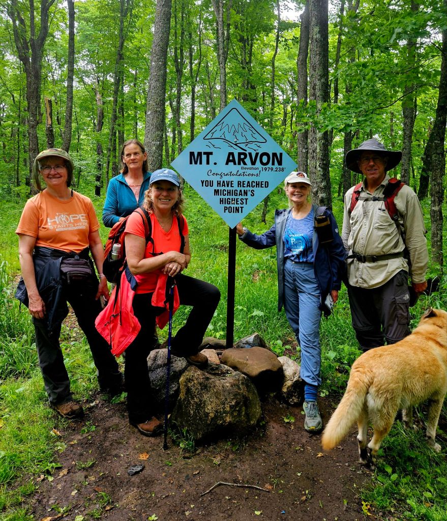 Yesterday, the Sunday hiking group climbed Mt. Arvon, the highest point in Michigan. It’s near Camp Many Moons, so I joined in. (Jeff passed. Because he’s been there many times, or would rather work, or the threatening rain. All three?) A few folks wore net “bug-hats” but the bugs were not out this time. Yay.