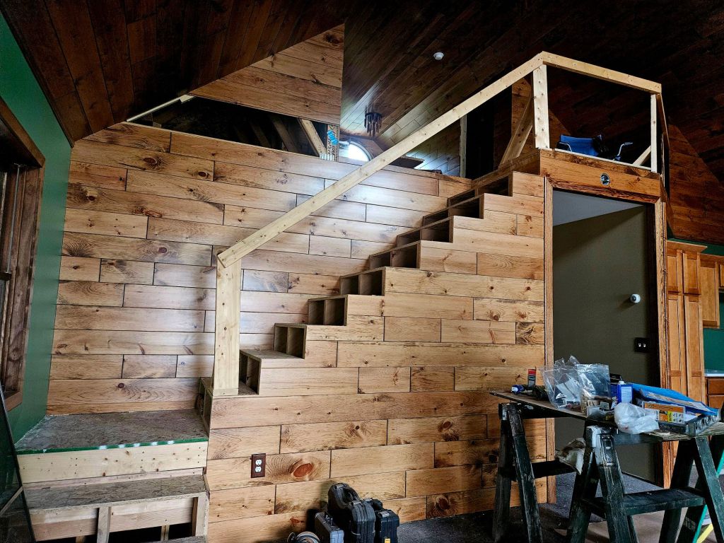 With the kitchen now awaiting appliances and backsplash, Jeff is turning his attention to the steps and I’m turning mine to the railing.