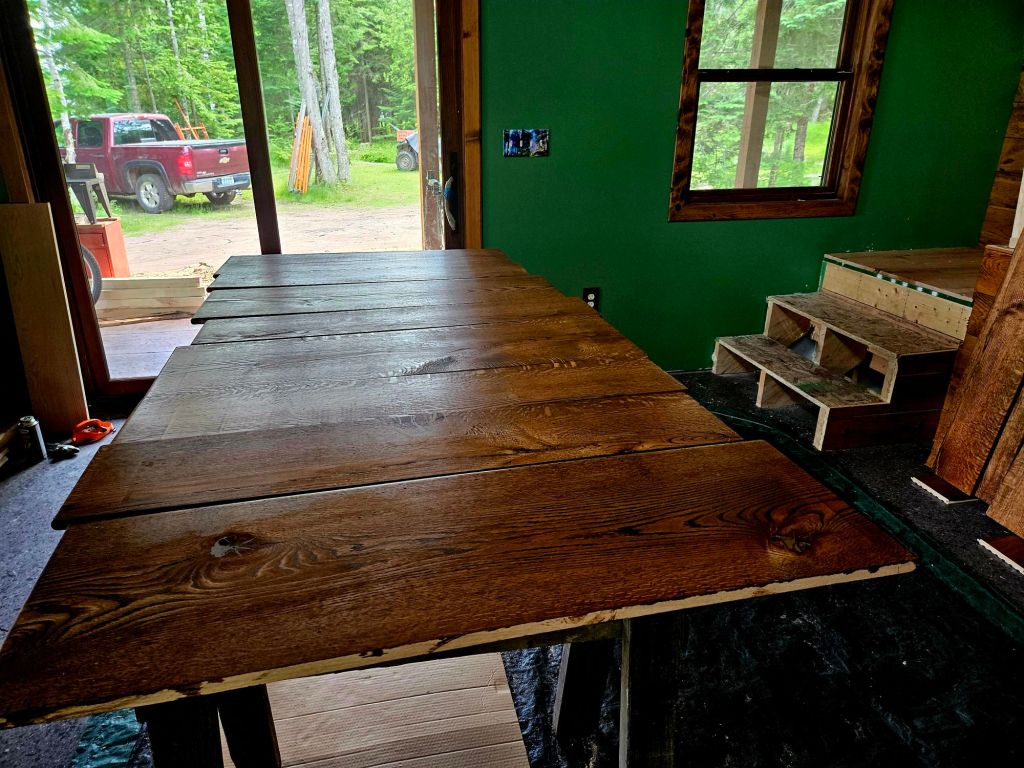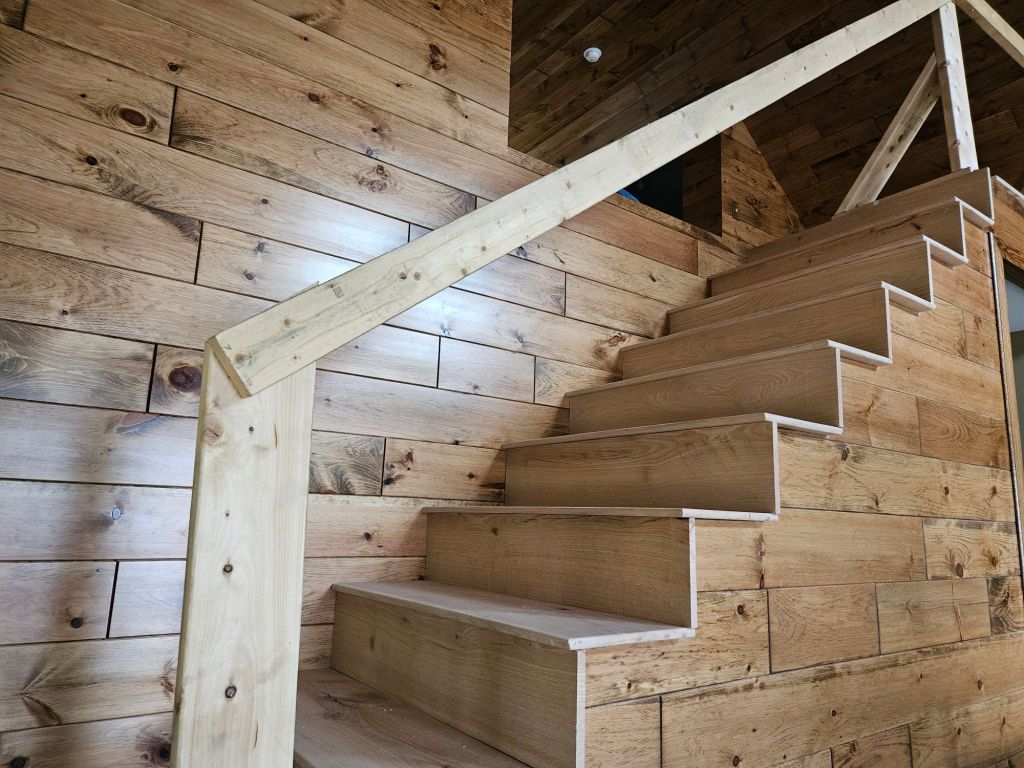 I wanted a cabin with a loft. We considered a pull-down stair (which I have in Virginia) but managed to make room for this. Jeff is building it…