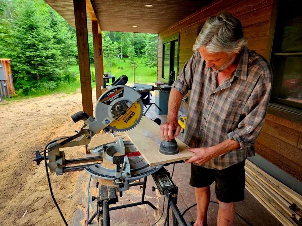 …using various woodworking tools which now sit on the concrete porch. Here, he uses a sander to smooth out a piece of oak. (He also has a planer, joiner, router table, and table saw. He used them all for this. All self-taught!)
