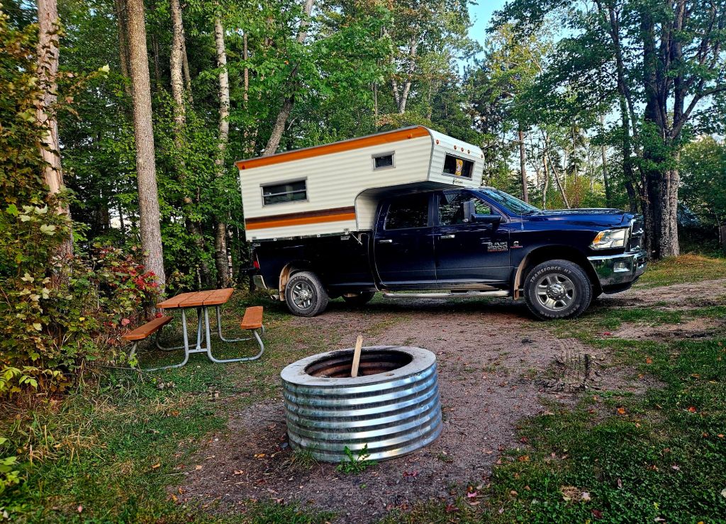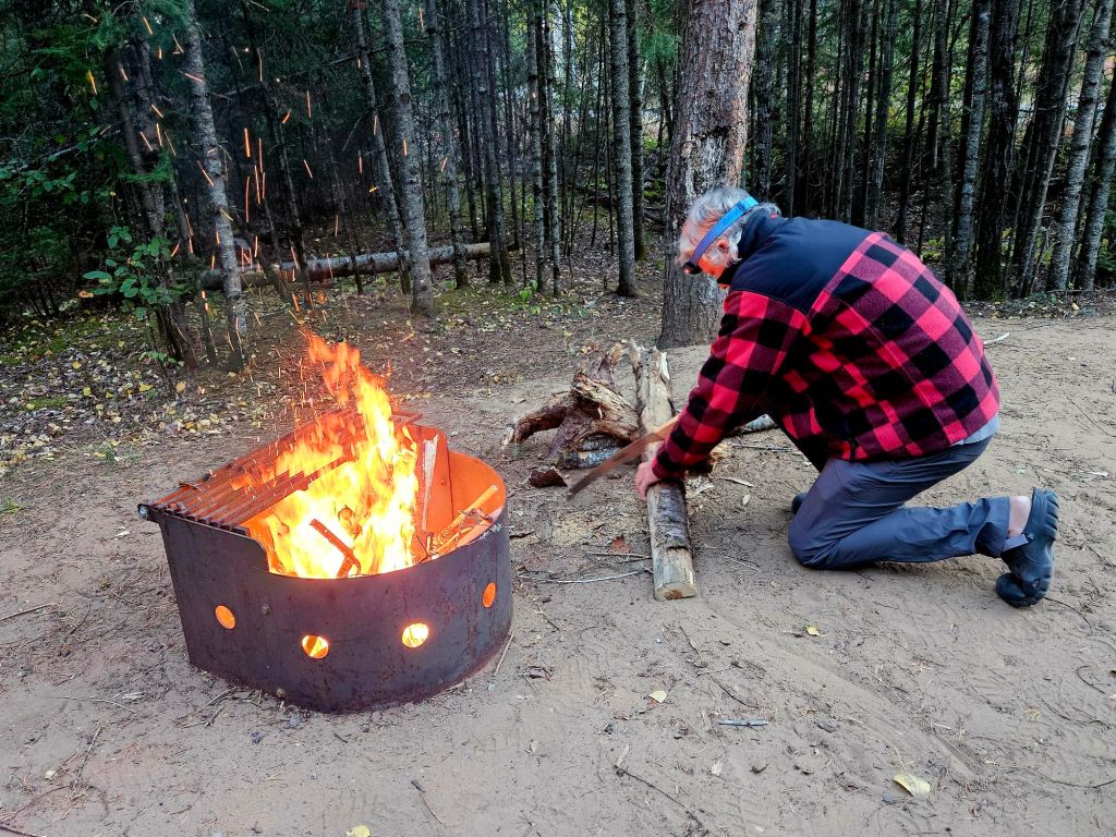 Many people do the Circle Tour by motel, but we like to camp. (A truck camper makes it easy, compared to the tent camping I’m used to doing.) Jeff had the foresight to bring a saw along and we made use of wood we found lying around. A little fire is always nice.