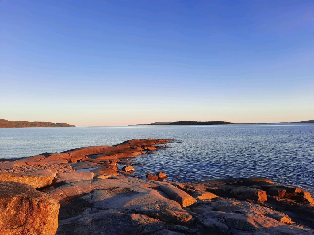 We saw a lot more islands from the north shore of the lake than from the south shore. The sunset illuminated the islands and rocks in front of us…