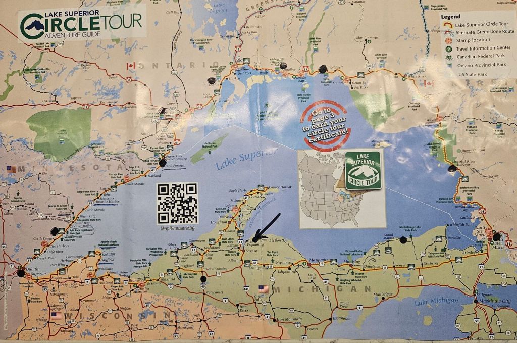 The “circle tour” map. The light yellow is Canada. The green is Michigan’s Upper Peninsula, where I was raised and now spend half the year. The arrow is where we began. We drove counter-clockwise in hopes of intercepting Jeff’s brother who was going clockwise. The black dots represent where we stopped for 11 nights. (We expected to be gone longer but the weather turned inhospitable.)