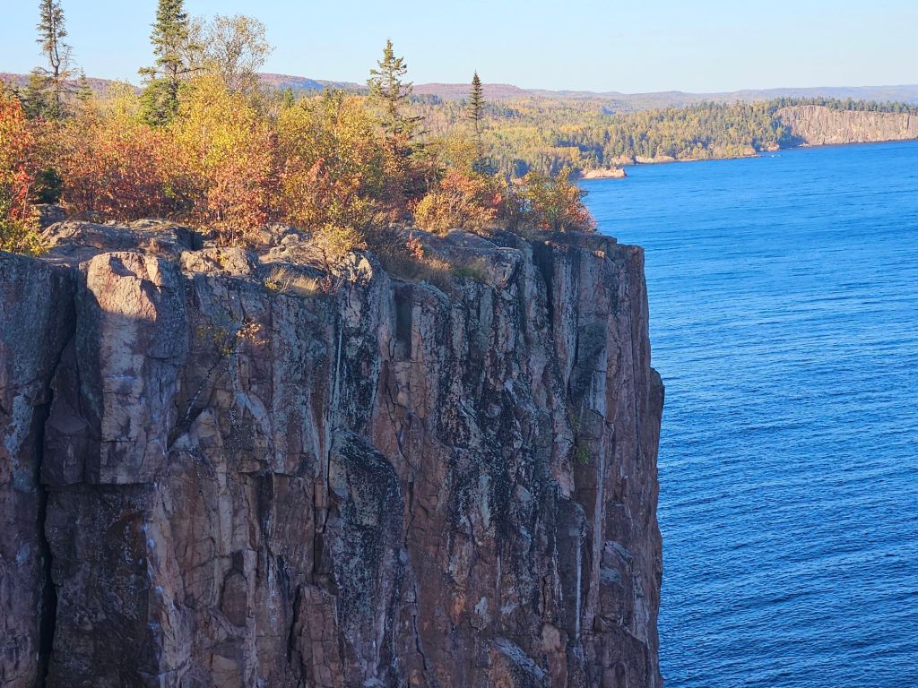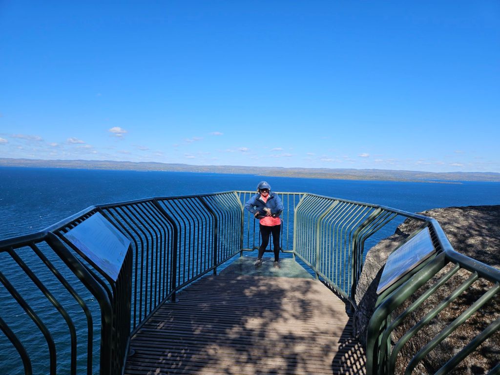 …the Thunder Bay overlook. This immovable platform juts out 90 feet (I think) above Lake Superior. The wind whipped. It was unnerving, even for height-lovers like me, but wow! The road here is narrow and sometimes bumpy, so only solid vehicles should attempt it.
