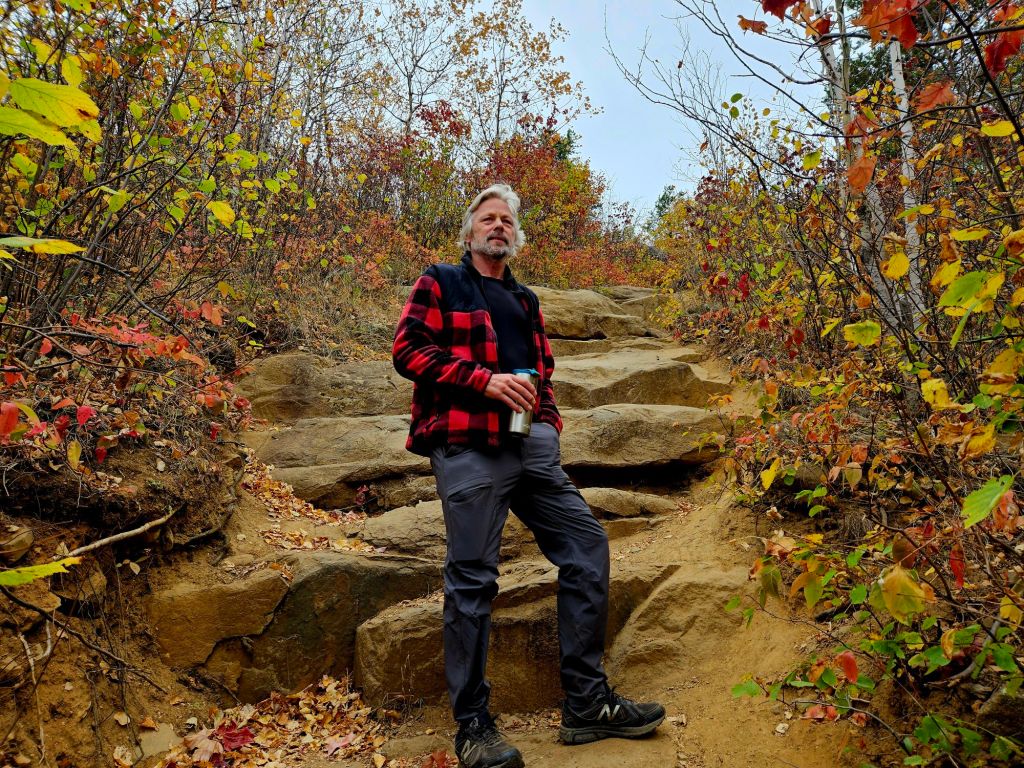On our way out of Canada, we stopped to hike up Mt. McKay which is on indigenous land. The trail was steep but big rocks like this made it easier. You can tell the weather had turned cold, as Jeff is wearing pants and shoes…unusual for him. (He spends all summer in shorts and crocs.)