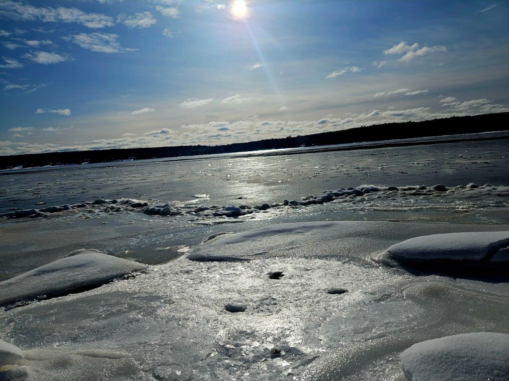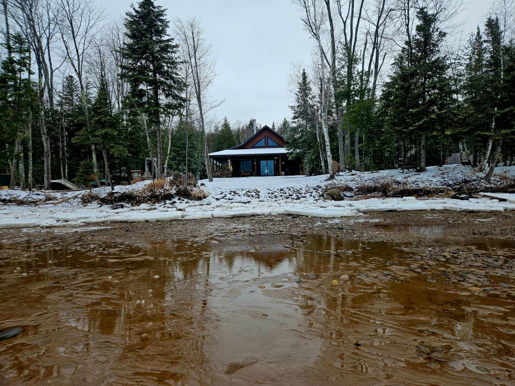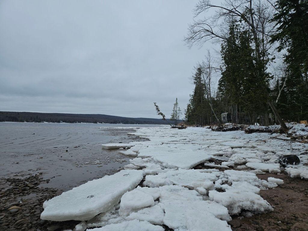 The break-up of the ice is a clear sign that spring is on the way, but it often re-forms before leaving for good. This is the shoreline of Camp Many Moons, spanning 300′.