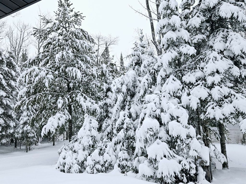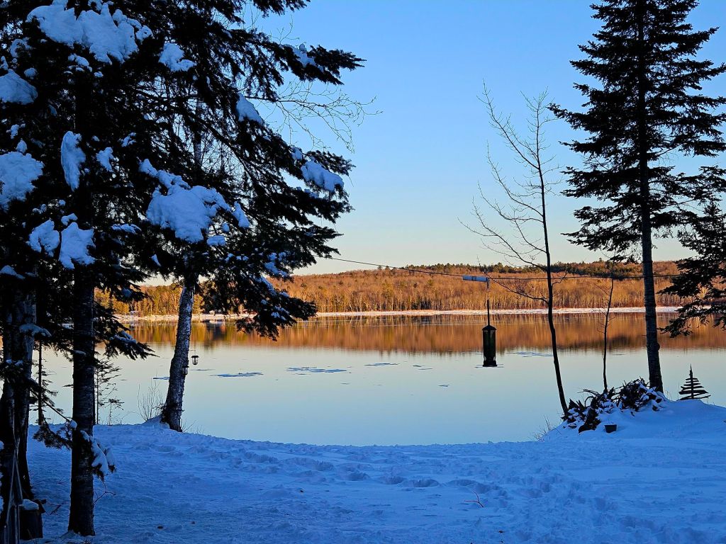 Scenes like this are common in April. I love it because I can snowshoe. But I haven’t spent the whole winter here; the permanent locals are tired of it by this point. (These trees are in front of the house. See the bay in the background?)