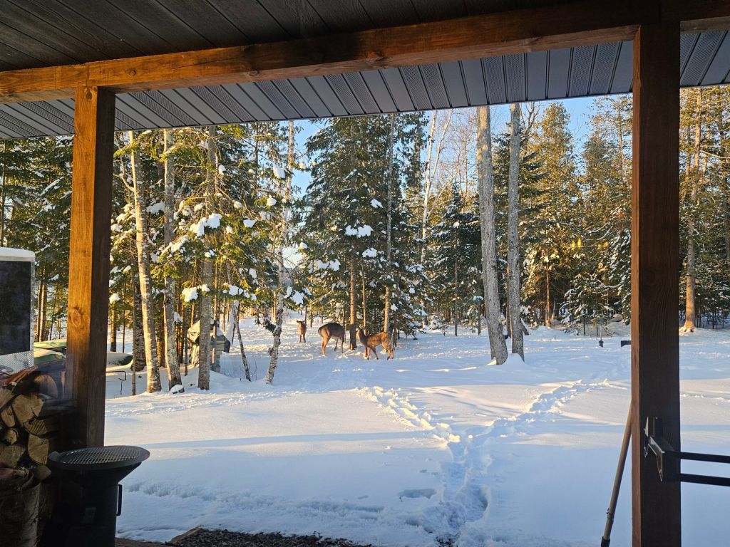 Part of my vision was the ability to sit in comfort during winter while watching the wildlife. And there they are. Jeff began to feed the deer here while I was away and I’ve kept it up. I’ve “adopted” a three-some that often comes close to the house. Sometimes very close.
