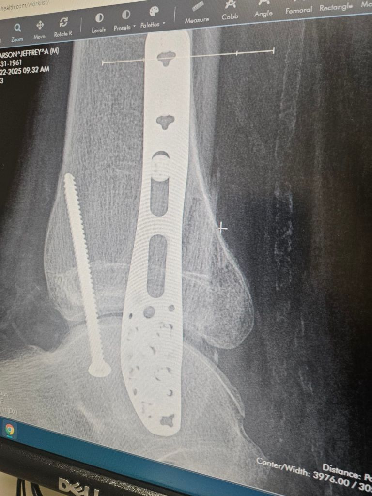 Here’s the reason for his immobility and my increased activity: Jeff’s right leg, both bones broken above the ankle, now sporting a plate and long screw. It was unusually slippery ice – the kind that even screws in your boot soles don’t handle well. Jeff was one of three broken legs that day in the ER of this very small town. His pain was bad–not just the break itself, but the recovery. It came and went for weeks.  The surgery wound was a concern also, and I learned a lot about wound care. I also learned how to resist speeding en route to the ER on icy roads!