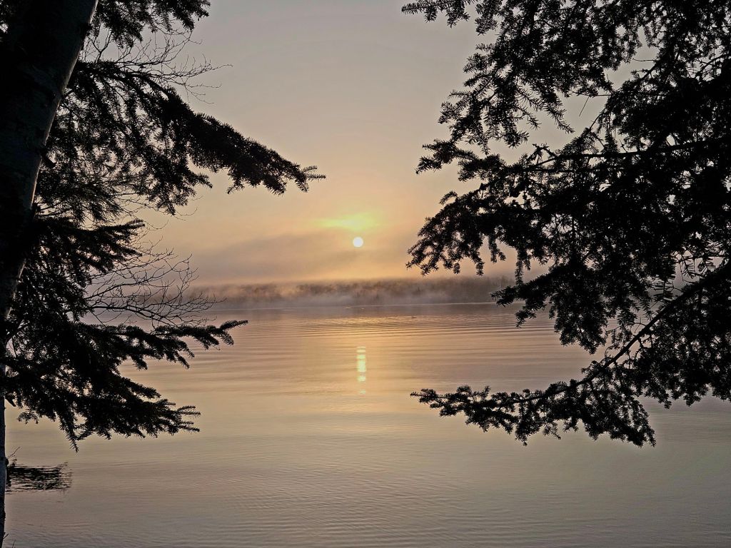 …and take time to notice the natural beauty all around. Fog shrouded the opposite bank at sunrise this morning. The water beckoned but it was too chilly (in the 30s) for a row.
