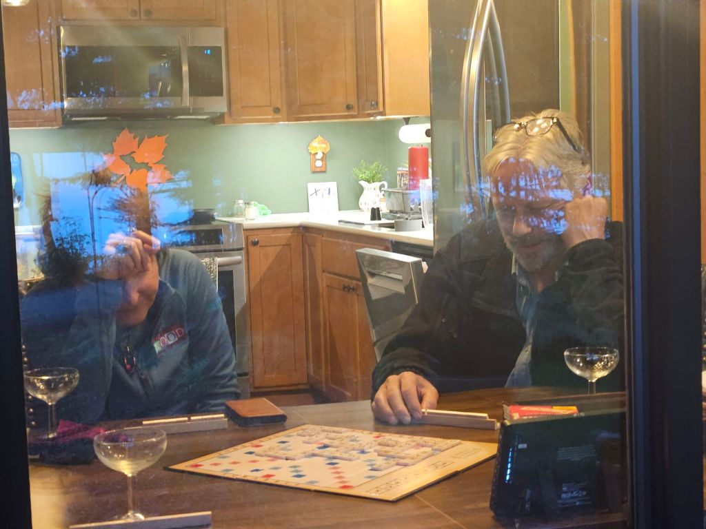 My friend June from the east coast was the first to arrive. So glad she was willing to play Scrabble! (The game doesn’t get much use.) This was one of those games that dragged on too long, and we finally ended it without a conclusion. Sometimes, the best conclusion is no conclusion. I took this picture through the window…Getting on the water is, of course, the main goal in summer. June was happy to kayak again, since it’s harder for her to do where she lives.Next, a couple from Jeff’s Great Loop adventure. They were the first of two RV rigs to use the waterfront this summer, thanks to the electrical and other amenities that he installed.Diane and Henry were on their boat DeDe when we met them on Jeff’s boat Many Moons. Like many boaters, they turn to RV travel when off the water. Their home is in Virginia.A few days later, my sister from Washington State and her husband. She came primarily for her 60th high school reunion.Since one sister was here, another came, also with husband…this one, formerly from Detroit, has moved just four hours away. It’s nice to have her closer.Both brothers-in-law took a dip..… while my sis and I paddled.Then another set of boating friends, and another RV on the waterfront. ( The tiny boat on the dock wasn’t getting used much, so I sold it.)Loren and Lisa, formerly of Irrational Exhuberance, live in Arizona now and were on a long road trip, making a point to stop by here – with their dog Piper, who also was on their boat with them.Some people are natural socializers. (Jeff, for example.) I am not, although I love to host and do it often in Virginia. When I feel overwhelmed, I escape to the water, grateful that it’s so close. Other introverts know what I mean!When all the visitors had gone, we returned to some practical tasks. Here, the “man who can fix anything” (as one neighbor said), in his Iron Mule, removes a huge log that we found submerged in the sand across the bay. (I had to get into the water with tow lines to manually tug it free from the mud before it would float.)Remembering why I am here in the first place, I visited my parents’ grave and considered how to improve its appearance. Cemeteries are such interesting places, holding so many stories of lives lived and history created. Wandering through them, the mind imagines all the stories we don’t know.This story I know. At least some of it. (There’s always so much we don’t know about someone else’s lives, even our parents.’ So many things I wish I had asked them! Isn’t that always the way?) Some white rock dressed it up a bit.