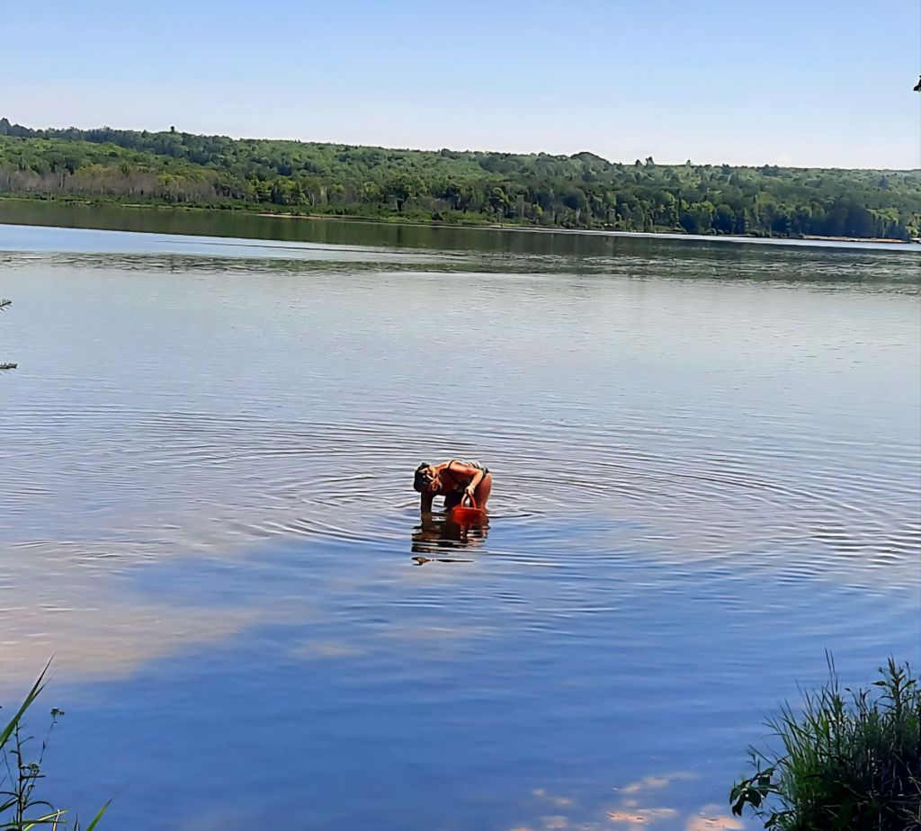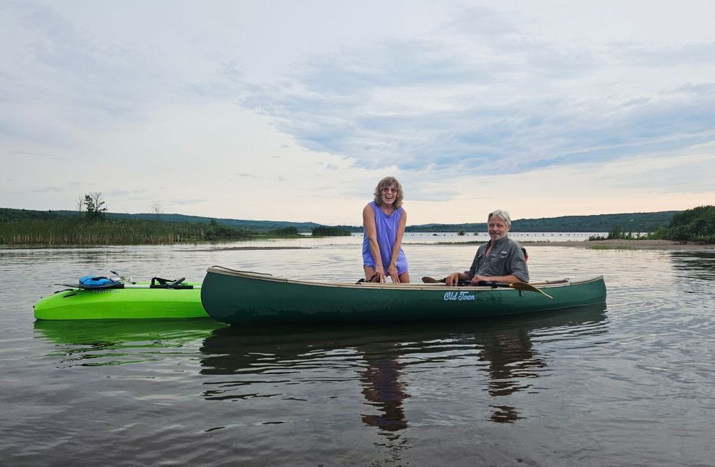 I’m usually on the water alone, but on this day he joined me in his canoe. I’m standing in the water here so you can see how shallow it is during “low tide!” (As you may have read previously in this blog, the incoming and outgoing water on Huron Bay acts like a tide but is actually called a seiche, or bathtub effect, as water sloshes back and forth in the big lake and into its bays. Because this bay is long and narrow, this happens a lot.)