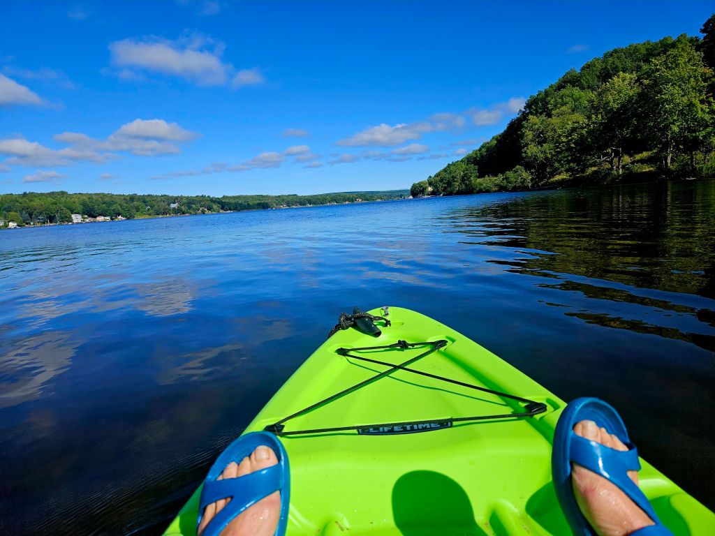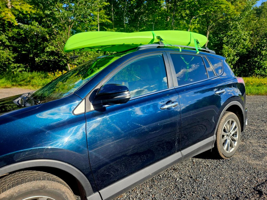 The sit-on-top kayak was my new addition to the human-powered fleet at Camp Many Moons. I looked for one light enough to get onto my car roof by myself. (It also fits inside, but a rooftop arrangement proved easier once I got used to ratchet straps.)