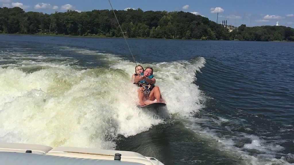 …of so many fun water outings with girlfriends, like this one about 10 years ago. Susan and I somehow managed to ride on the wake-surf board together for a few minutes before falling off. Why? Just for fun! (We also did actually surf. And wake-board, water ski, and sail. Some of my best water play was with this fun and kind woman.)