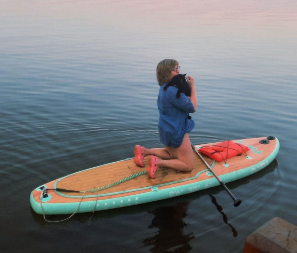 Many people live on the water, or wish they did, for the calm that it offers. They appreciate simply looking at it. It calms me, too — but some of us need to experience it with more than our eyes. We want to feel it under us, and around us. We want to play with it. Here, in photos and captions, are several ways I did that this summer–sometimes with the cat named Boo.