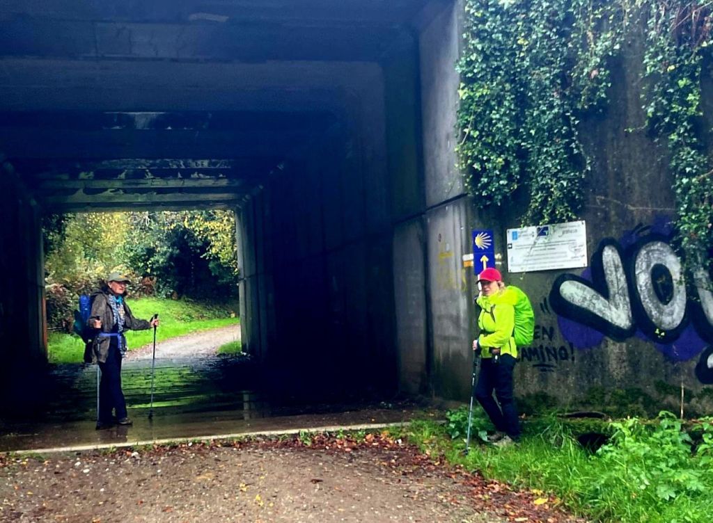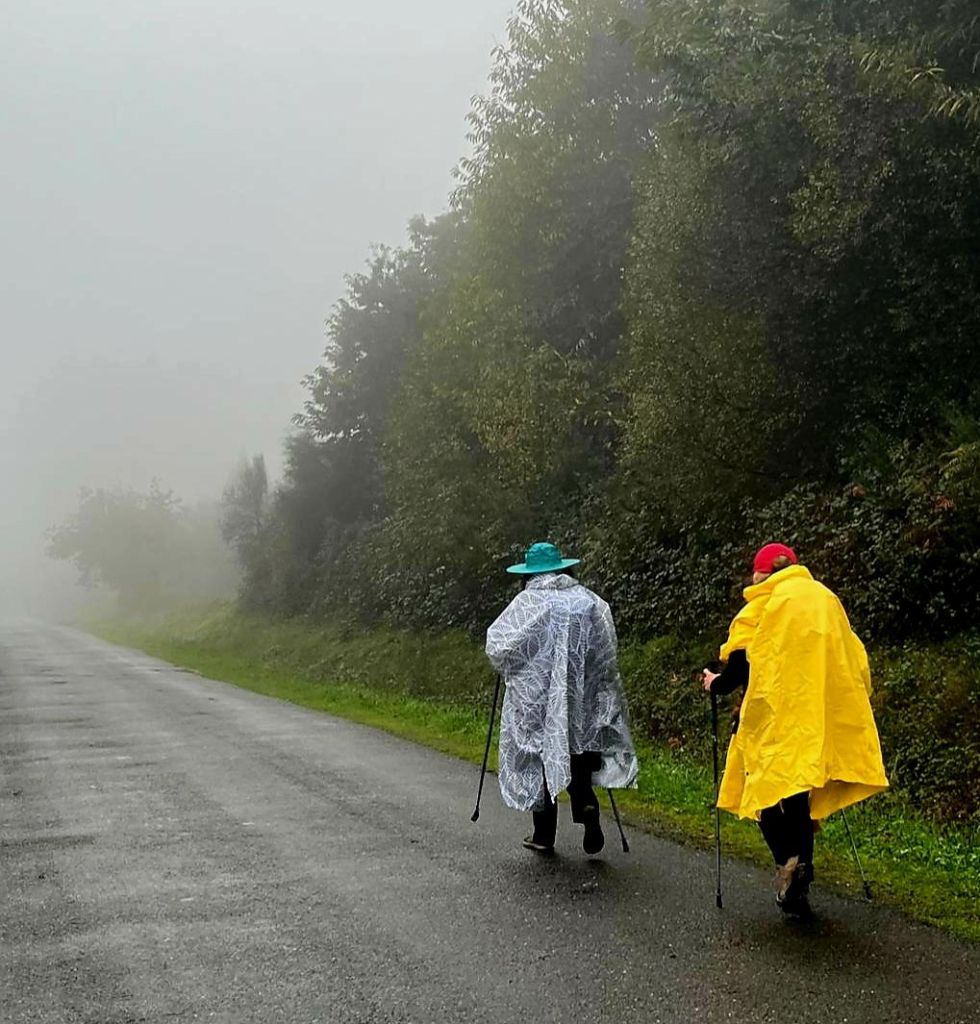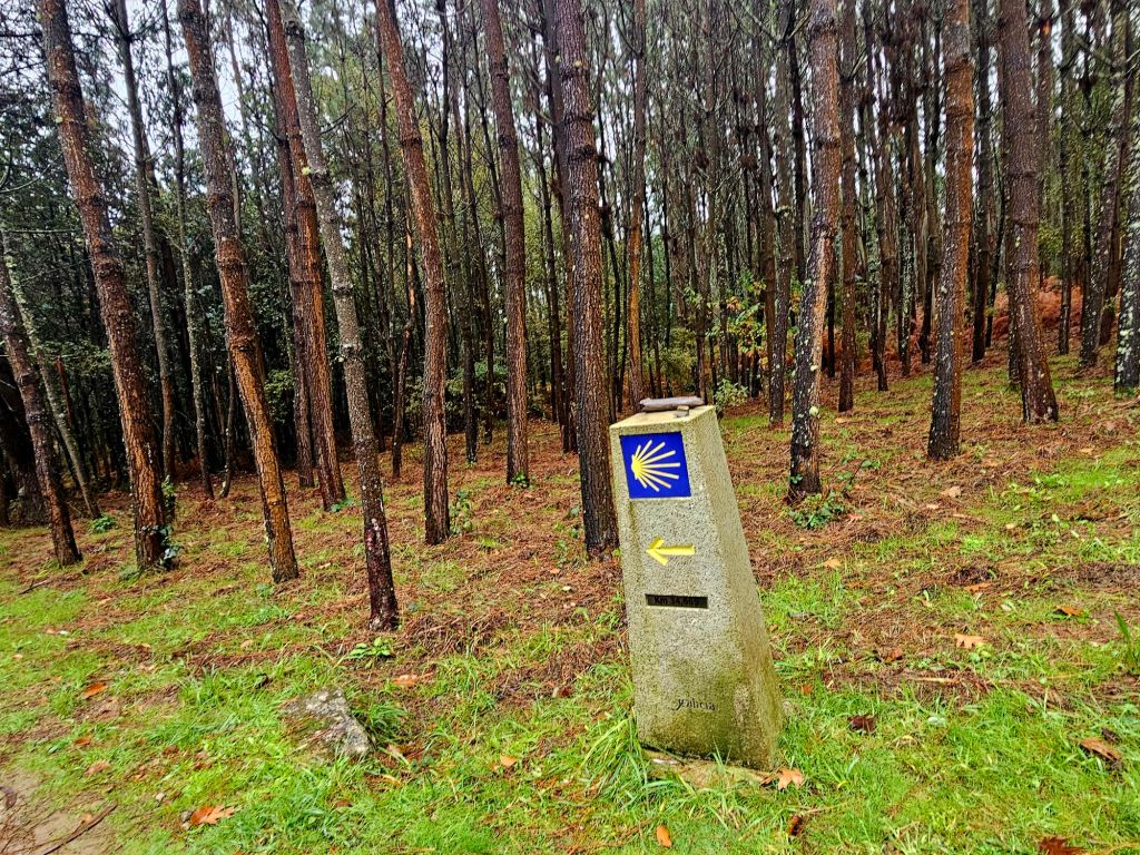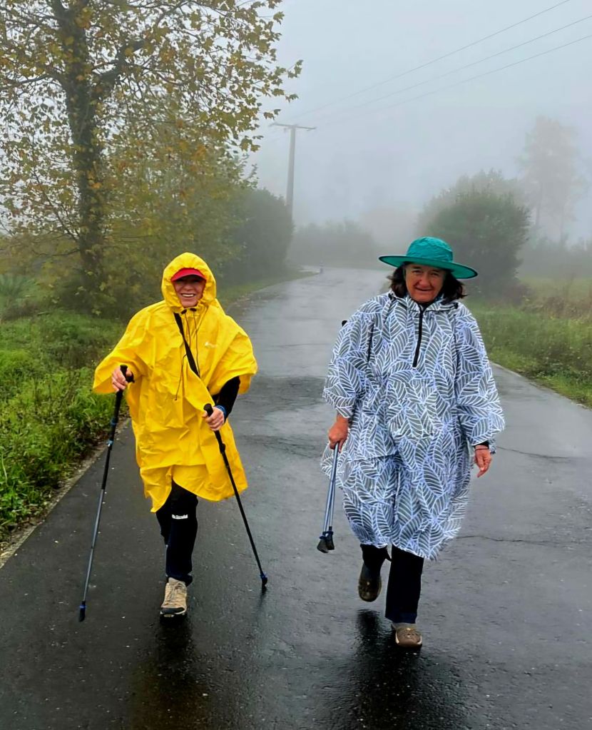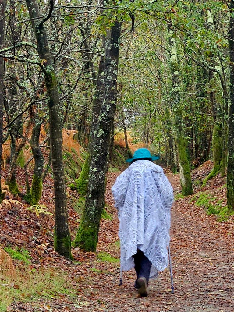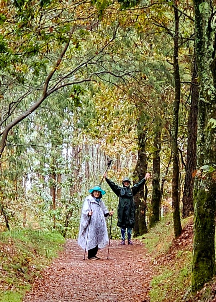 This map, from the app “Buen Camino,” shows our route from Ferrol to tonight’s destination (the blue dot on bottom). We’ve done that yellow line by foot – about 55 miles. Less than 20 miles to go. That’s the Atlantic Ocean on the left.Our morning began by donning our rain gear. And boy, did we need it.It rained hard for at least an hour. Ginny managed well in rain hat and poncho.It rained hard enough to make rivers and puddles. Our feet were soaked within minutes.But rain doesn’t stop intrepid pilgrims!Gin and I both managed a smile, and it wasn’t faked. We were glad to make use of our ponchos, since we hauled them across the ocean. But we hoped to not wear them for long.Maria said, before taking this picture, “look like you’re pushing it!” So I imagined Dan Rather leaning into those hurricanes on TV. And I leaned. 😄Maria and Ginny, commiserating. No views this morning even though we were high.The mist added extra mystery to old buildings.We didn’t bother to sit at this very special (and very wet) pilgrims’ roadside stop, even though it was one of the prettiest I’ve seen.It was still raining as we passed this peculiar hilltop sculpture, and I didn’t bother to look up what it was.As usual, we split up at times, each walking our own pace. I caught up with Gin waiting out the rain in this bus stop.This cat wasn’t deterred by the rain and walked head-long toward Ginny.Then we passed again into glorious forest, still wearing our ponchos. I had switched to putting my backpack over my poncho. With its green rain cover on.Gin and Maria, happy to be off the roads!My oldest sis looks like a hunchback. 😄Once in the forest, the rain abated. We repacked our ponchos and enjoyed the scenery.And it was glorious!Forward into the forest!I was just so grateful to be here.We passed through several intersections in the forest, well-marked by arrows.We stopped at a cafe to fortify with hot coffee and ring out our soaked socks.Then back into the autumn-tinged forest.Maria took this picture of Ginny and me both taking pictures…… and then a selfie.Passing under an overpass…… and past a colorful multilingual sign.The sun kept trying to come out.But it didn’t matter that it never did.Nature doesn’t always scream. Sometimes it whispers.Another wall’sized mural recognizing some benefactor to the pilgrims’ way. We are in an agricultural region so this one is, of course, in plaid.Reaching our lodging for the night, we fortified with another coffee and then continued on to add some miles. (This was in order to make our last day into Santiago shorter, so we could avoid the huge afternoon crowds there. We took a taxi back to our lodgings.)Back into the woods again, we encountered the guy with the red backpack who spoke with an English accent. But we still aren’t sure of his nationality.So much green today!We reached the spot — a pilgrims’ rest stop – for the prearranged taxi pickup. By this time, the sun was fully out.Ginny relaxed on the stone bench while waiting for the taxi pickup.Our lodging tonight is the best yet. It could rival the best BnBs in Europe.The vestibule. Note the stone walls.This private home-come-guest lodge was built in the 18th century. We heard it is up for sale for more than 900,000 euros. ( More than a million USD.)I finished the day with a stroll around “town,” which is more like an agricultural settlement. Complete with chickens in yards.It’s interesting that so many readers of this blog are from other countries this week. Not surprising, since El Camino is an international experience. I hope this blog inspires other wary would-be walkers to try it out, perhaps the way we are doing it. Better to want more than to want to quit!