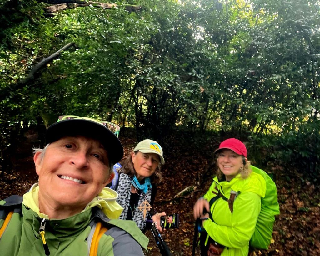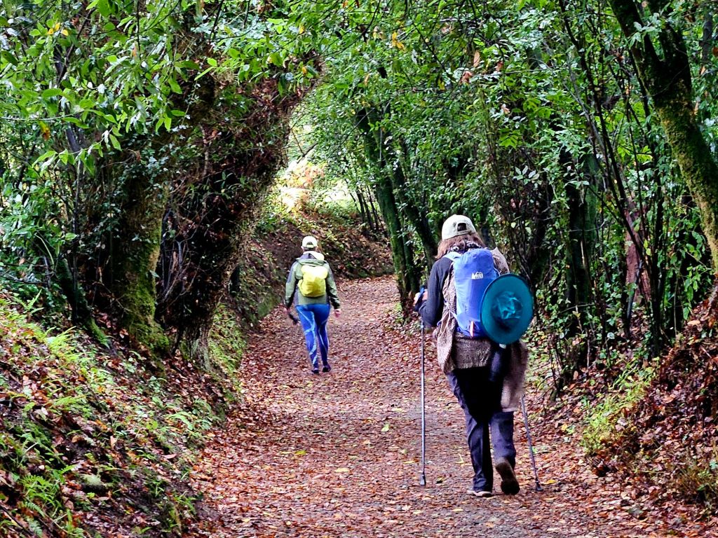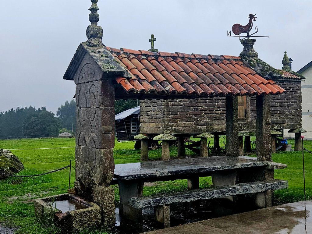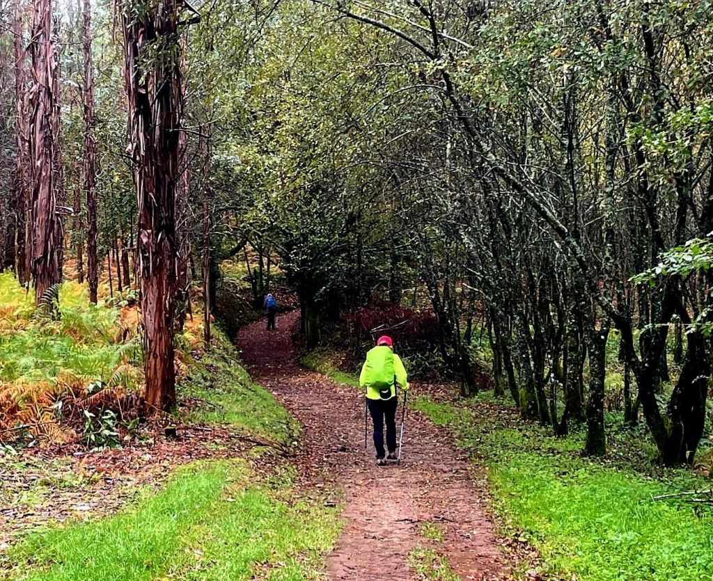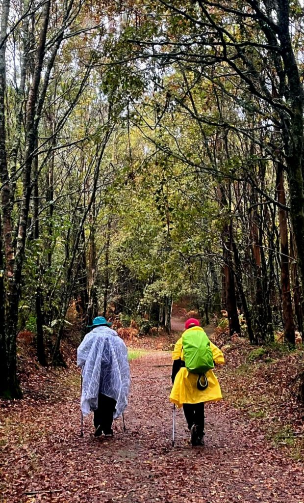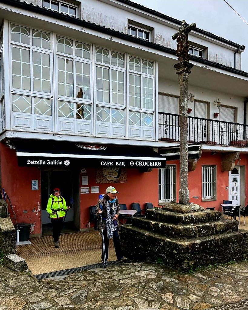 This map, from the app “Buen Camino,” shows our route from Ferrol to tonight’s destination (the blue dot on bottom). We’ve done that yellow line by foot – about 55 miles. Less than 20 miles to go. That’s the Atlantic Ocean on the left.Our morning began by donning our rain gear. And boy, did we need it.It rained hard for at least an hour. Ginny managed well in rain hat and poncho.It rained hard enough to make rivers and puddles. Our feet were soaked within minutes.But rain doesn’t stop intrepid pilgrims!Gin and I both managed a smile, and it wasn’t faked. We were glad to make use of our ponchos, since we hauled them across the ocean. But we hoped to not wear them for long.Maria said, before taking this picture, “look like you’re pushing it!” So I imagined Dan Rather leaning into those hurricanes on TV. And I leaned. 😄Maria and Ginny, commiserating. No views this morning even though we were high.The mist added extra mystery to old buildings.We didn’t bother to sit at this very special (and very wet) pilgrims’ roadside stop, even though it was one of the prettiest I’ve seen.It was still raining as we passed this peculiar hilltop sculpture, and I didn’t bother to look up what it was.As usual, we split up at times, each walking our own pace. I caught up with Gin waiting out the rain in this bus stop.This cat wasn’t deterred by the rain and walked head-long toward Ginny.Then we passed again into glorious forest, still wearing our ponchos. I had switched to putting my backpack over my poncho. With its green rain cover on.Gin and Maria, happy to be off the roads!My oldest sis looks like a hunchback. 😄Once in the forest, the rain abated. We repacked our ponchos and enjoyed the scenery.And it was glorious!Forward into the forest!I was just so grateful to be here.We passed through several intersections in the forest, well-marked by arrows.We stopped at a cafe to fortify with hot coffee and ring out our soaked socks.Then back into the autumn-tinged forest.Maria took this picture of Ginny and me both taking pictures…… and then a selfie.Passing under an overpass…… and past a colorful multilingual sign.The sun kept trying to come out.But it didn’t matter that it never did.Nature doesn’t always scream. Sometimes it whispers.Another wall’sized mural recognizing some benefactor to the pilgrims’ way. We are in an agricultural region so this one is, of course, in plaid.Reaching our lodging for the night, we fortified with another coffee and then continued on to add some miles. (This was in order to make our last day into Santiago shorter, so we could avoid the huge afternoon crowds there. We took a taxi back to our lodgings.)Back into the woods again, we encountered the guy with the red backpack who spoke with an English accent. But we still aren’t sure of his nationality.So much green today!We reached the spot — a pilgrims’ rest stop – for the prearranged taxi pickup. By this time, the sun was fully out.Ginny relaxed on the stone bench while waiting for the taxi pickup.Our lodging tonight is the best yet. It could rival the best BnBs in Europe.The vestibule. Note the stone walls.This private home-come-guest lodge was built in the 18th century. We heard it is up for sale for more than 900,000 euros. ( More than a million USD.)I finished the day with a stroll around “town,” which is more like an agricultural settlement. Complete with chickens in yards.It’s interesting that so many readers of this blog are from other countries this week. Not surprising, since El Camino is an international experience. I hope this blog inspires other wary would-be walkers to try it out, perhaps the way we are doing it. Better to want more than to want to quit!