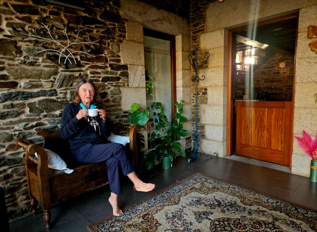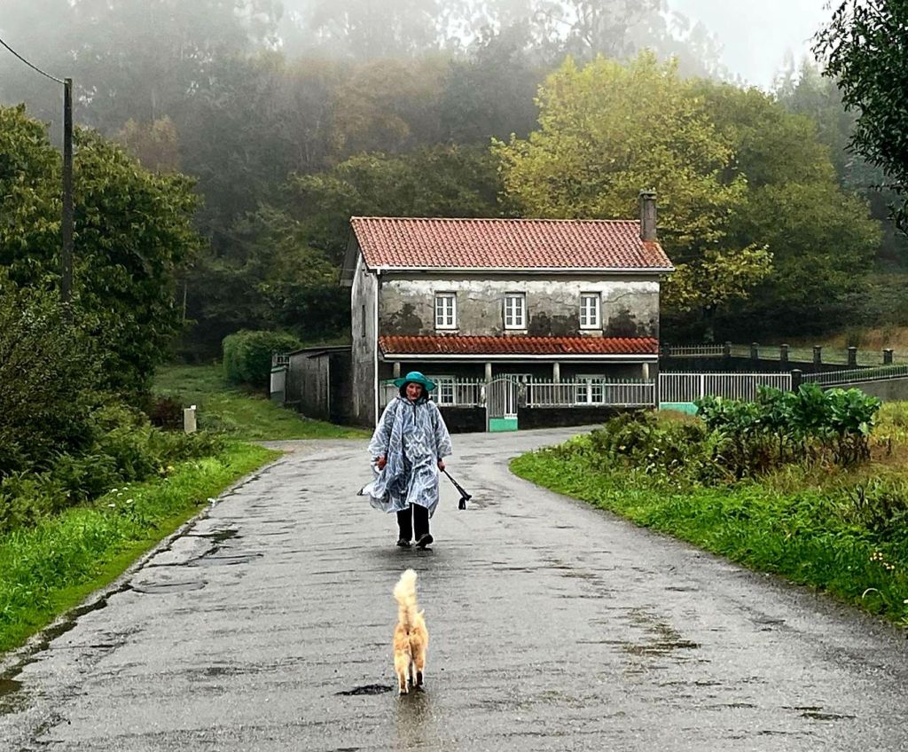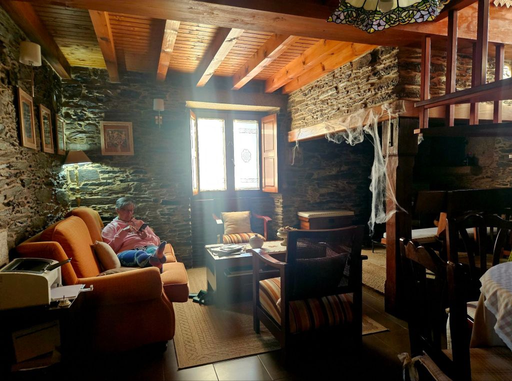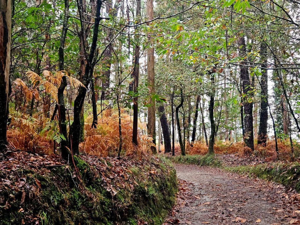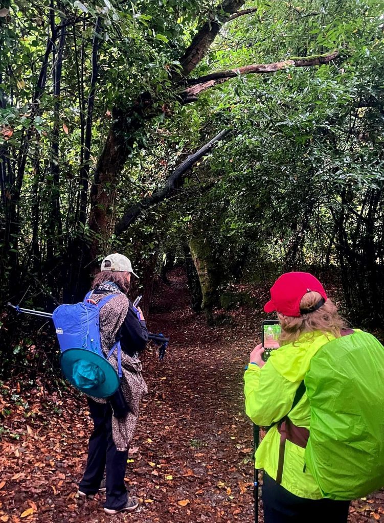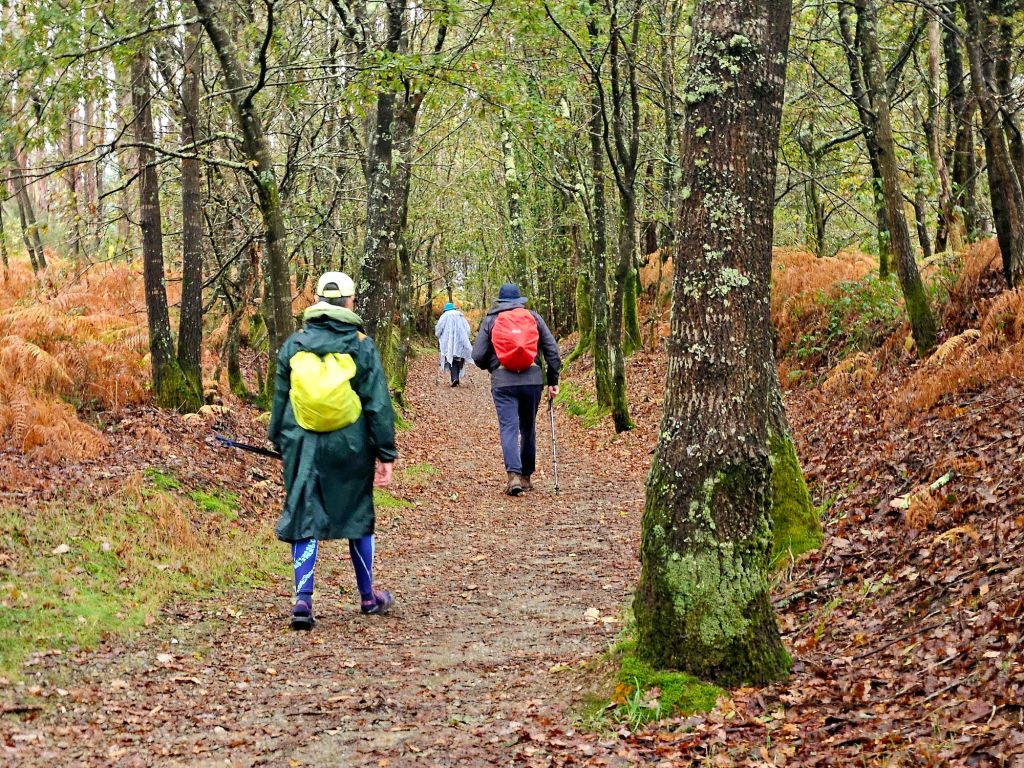This map, from the app “Buen Camino,” shows our route from Ferrol to tonight’s destination (the blue dot on bottom). We’ve done that yellow line by foot – about 55 miles. Less than 20 miles to go. That’s the Atlantic Ocean on the left.Our morning began by donning our rain gear. And boy, did we need it.It rained hard for at least an hour. Ginny managed well in rain hat and poncho.It rained hard enough to make rivers and puddles. Our feet were soaked within minutes.But rain doesn’t stop intrepid pilgrims!Gin and I both managed a smile, and it wasn’t faked. We were glad to make use of our ponchos, since we hauled them across the ocean. But we hoped to not wear them for long.Maria said, before taking this picture, “look like you’re pushing it!” So I imagined Dan Rather leaning into those hurricanes on TV. And I leaned. 😄Maria and Ginny, commiserating. No views this morning even though we were high.The mist added extra mystery to old buildings.We didn’t bother to sit at this very special (and very wet) pilgrims’ roadside stop, even though it was one of the prettiest I’ve seen.It was still raining as we passed this peculiar hilltop sculpture, and I didn’t bother to look up what it was.As usual, we split up at times, each walking our own pace. I caught up with Gin waiting out the rain in this bus stop.This cat wasn’t deterred by the rain and walked head-long toward Ginny.Then we passed again into glorious forest, still wearing our ponchos. I had switched to putting my backpack over my poncho. With its green rain cover on.Gin and Maria, happy to be off the roads!My oldest sis looks like a hunchback. 😄Once in the forest, the rain abated. We repacked our ponchos and enjoyed the scenery.And it was glorious!Forward into the forest!I was just so grateful to be here.We passed through several intersections in the forest, well-marked by arrows.We stopped at a cafe to fortify with hot coffee and ring out our soaked socks.Then back into the autumn-tinged forest.Maria took this picture of Ginny and me both taking pictures…… and then a selfie.Passing under an overpass…… and past a colorful multilingual sign.The sun kept trying to come out.But it didn’t matter that it never did.Nature doesn’t always scream. Sometimes it whispers.Another wall’sized mural recognizing some benefactor to the pilgrims’ way. We are in an agricultural region so this one is, of course, in plaid.Reaching our lodging for the night, we fortified with another coffee and then continued on to add some miles. (This was in order to make our last day into Santiago shorter, so we could avoid the huge afternoon crowds there. We took a taxi back to our lodgings.)Back into the woods again, we encountered the guy with the red backpack who spoke with an English accent. But we still aren’t sure of his nationality.So much green today!We reached the spot — a pilgrims’ rest stop – for the prearranged taxi pickup. By this time, the sun was fully out.Ginny relaxed on the stone bench while waiting for the taxi pickup.Our lodging tonight is the best yet. It could rival the best BnBs in Europe.The vestibule. Note the stone walls.This private home-come-guest lodge was built in the 18th century. We heard it is up for sale for more than 900,000 euros. ( More than a million USD.)I finished the day with a stroll around “town,” which is more like an agricultural settlement. Complete with chickens in yards.It’s interesting that so many readers of this blog are from other countries this week. Not surprising, since El Camino is an international experience. I hope this blog inspires other wary would-be walkers to try it out, perhaps the way we are doing it. Better to want more than to want to quit!