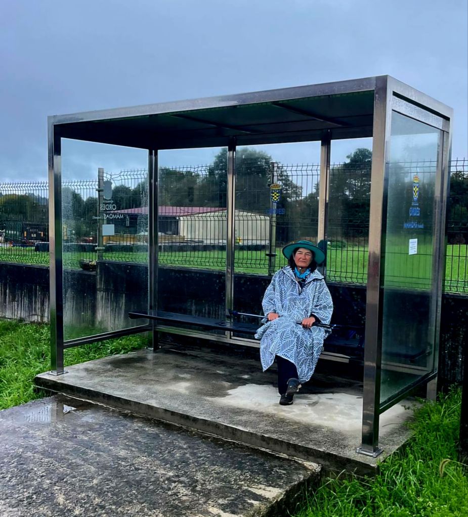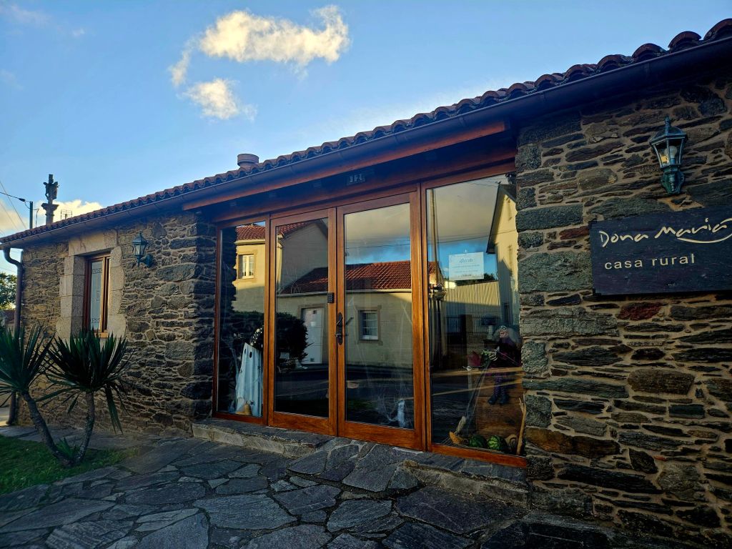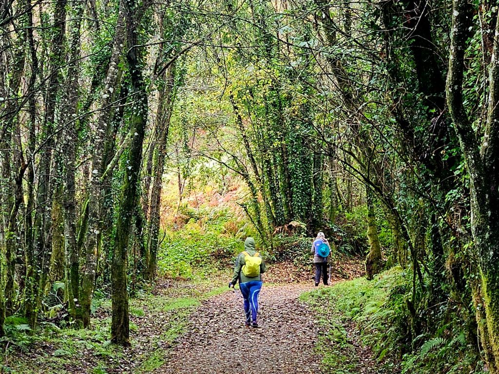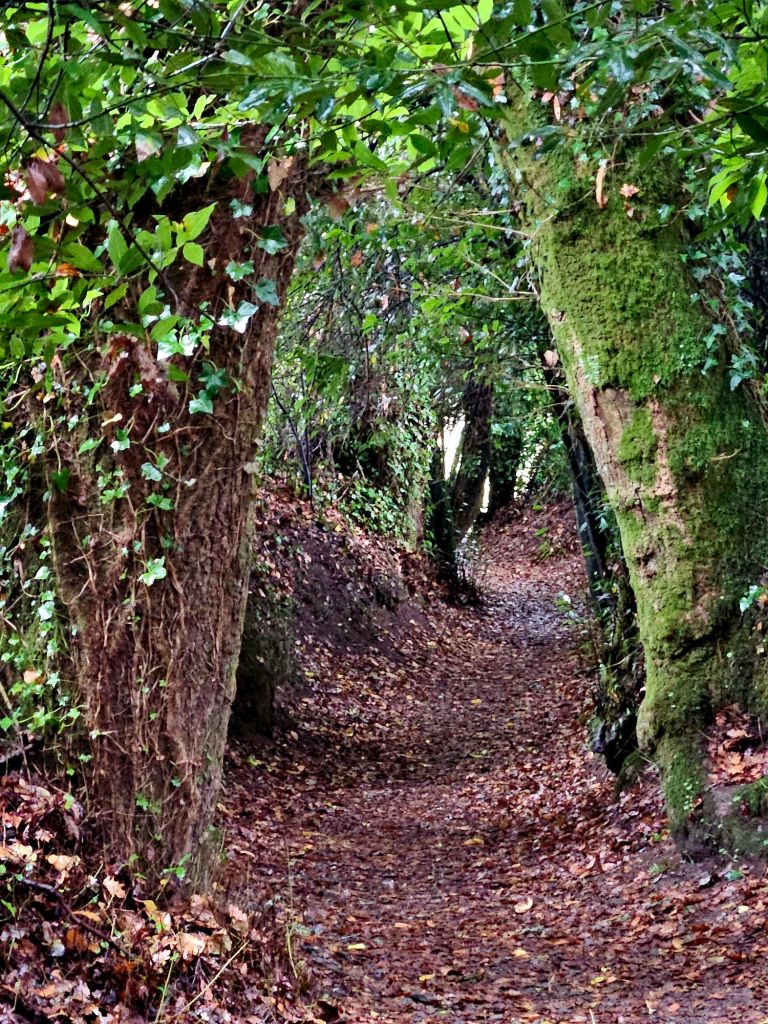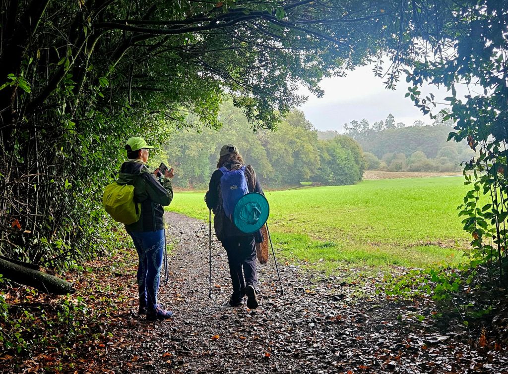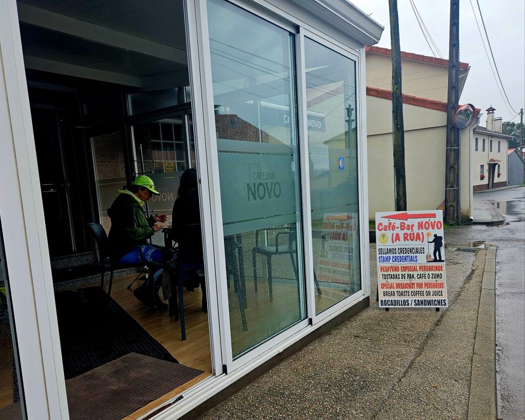 This map, from the app “Buen Camino,” shows our route from Ferrol to tonight’s destination (the blue dot on bottom). We’ve done that yellow line by foot – about 55 miles. Less than 20 miles to go. That’s the Atlantic Ocean on the left.Our morning began by donning our rain gear. And boy, did we need it.It rained hard for at least an hour. Ginny managed well in rain hat and poncho.It rained hard enough to make rivers and puddles. Our feet were soaked within minutes.But rain doesn’t stop intrepid pilgrims!Gin and I both managed a smile, and it wasn’t faked. We were glad to make use of our ponchos, since we hauled them across the ocean. But we hoped to not wear them for long.Maria said, before taking this picture, “look like you’re pushing it!” So I imagined Dan Rather leaning into those hurricanes on TV. And I leaned. 😄Maria and Ginny, commiserating. No views this morning even though we were high.The mist added extra mystery to old buildings.We didn’t bother to sit at this very special (and very wet) pilgrims’ roadside stop, even though it was one of the prettiest I’ve seen.It was still raining as we passed this peculiar hilltop sculpture, and I didn’t bother to look up what it was.As usual, we split up at times, each walking our own pace. I caught up with Gin waiting out the rain in this bus stop.This cat wasn’t deterred by the rain and walked head-long toward Ginny.Then we passed again into glorious forest, still wearing our ponchos. I had switched to putting my backpack over my poncho. With its green rain cover on.Gin and Maria, happy to be off the roads!My oldest sis looks like a hunchback. 😄Once in the forest, the rain abated. We repacked our ponchos and enjoyed the scenery.And it was glorious!Forward into the forest!I was just so grateful to be here.We passed through several intersections in the forest, well-marked by arrows.We stopped at a cafe to fortify with hot coffee and ring out our soaked socks.Then back into the autumn-tinged forest.Maria took this picture of Ginny and me both taking pictures…… and then a selfie.Passing under an overpass…… and past a colorful multilingual sign.The sun kept trying to come out.But it didn’t matter that it never did.Nature doesn’t always scream. Sometimes it whispers.Another wall’sized mural recognizing some benefactor to the pilgrims’ way. We are in an agricultural region so this one is, of course, in plaid.Reaching our lodging for the night, we fortified with another coffee and then continued on to add some miles. (This was in order to make our last day into Santiago shorter, so we could avoid the huge afternoon crowds there. We took a taxi back to our lodgings.)Back into the woods again, we encountered the guy with the red backpack who spoke with an English accent. But we still aren’t sure of his nationality.So much green today!We reached the spot — a pilgrims’ rest stop – for the prearranged taxi pickup. By this time, the sun was fully out.Ginny relaxed on the stone bench while waiting for the taxi pickup.Our lodging tonight is the best yet. It could rival the best BnBs in Europe.The vestibule. Note the stone walls.This private home-come-guest lodge was built in the 18th century. We heard it is up for sale for more than 900,000 euros. ( More than a million USD.)I finished the day with a stroll around “town,” which is more like an agricultural settlement. Complete with chickens in yards.It’s interesting that so many readers of this blog are from other countries this week. Not surprising, since El Camino is an international experience. I hope this blog inspires other wary would-be walkers to try it out, perhaps the way we are doing it. Better to want more than to want to quit!