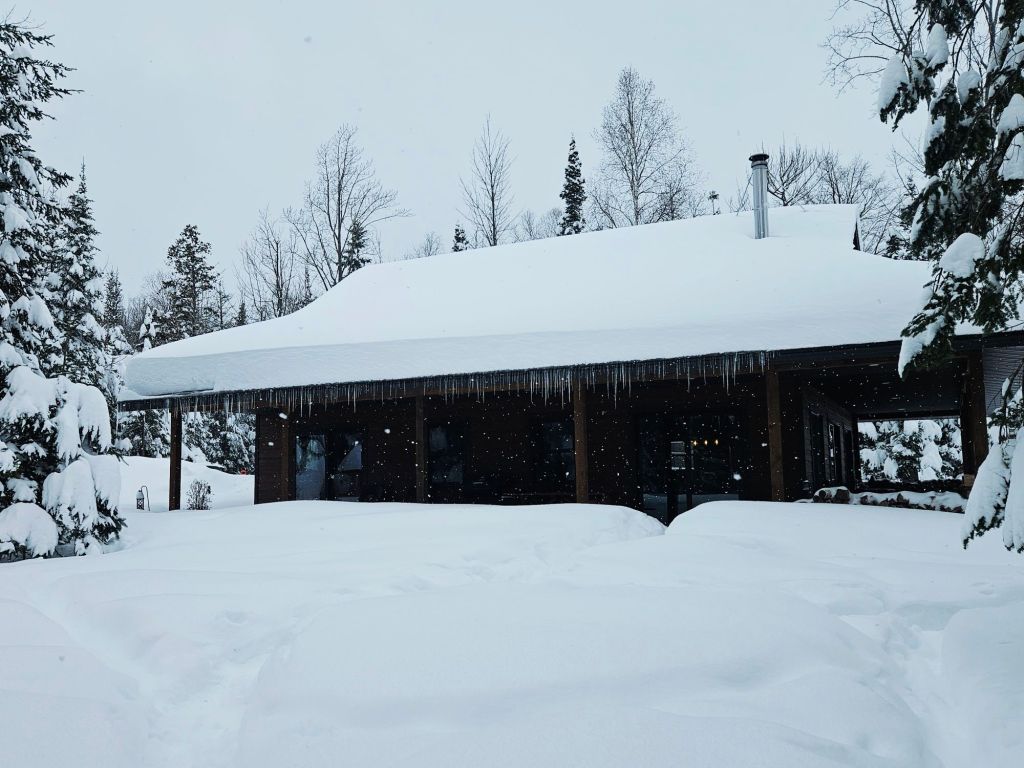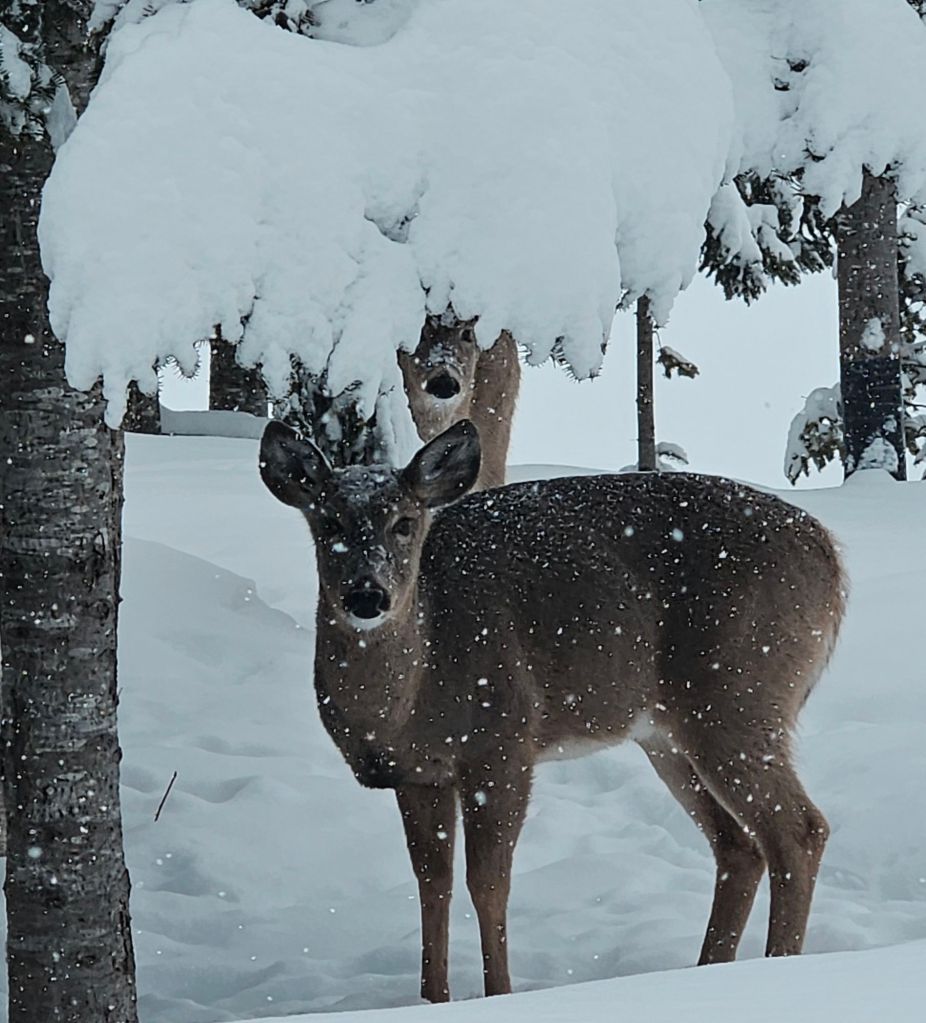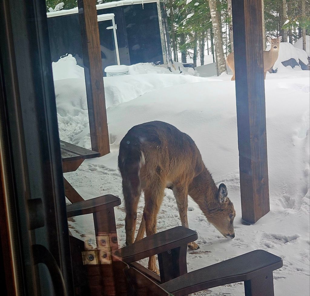 As regular readers know by now, I feed a handful of deer here at Camp Many Moons on the shore of Huron Bay (which is connected to Lake Superior.) They are getting more bold by the day, as you’ll see in the final photo. I’m feeding them, so I’m asking for it. I love this photo because you see the icicles on the roof.