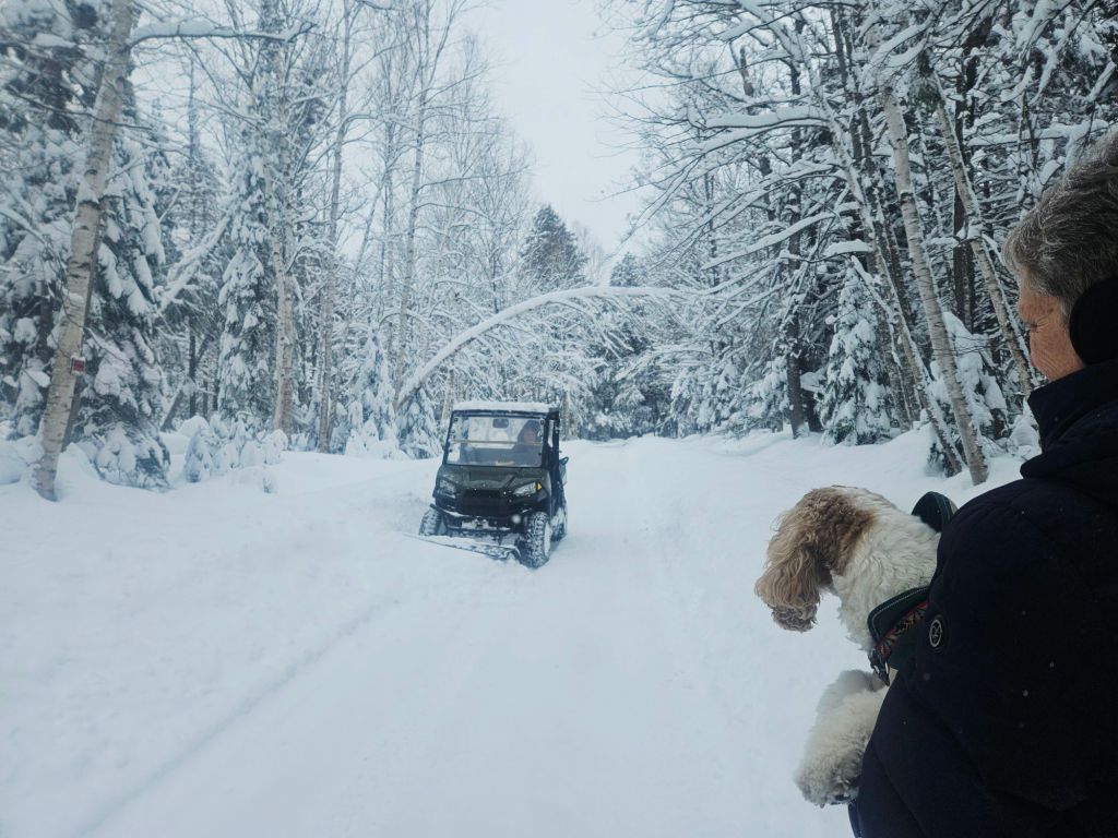 A neighbor uses his ATV with a plow to help keep the road cleared while another neighbor holds back her cocker spaniel until he passes. That branch has been bending over the road since last Thanksgiving, but it isn’t going any lower. Yet. (The couple with the ATV are the only full-time residents on this road right now. The rest of us come-and-go.) I also hire a plow truck to come through as needed.
