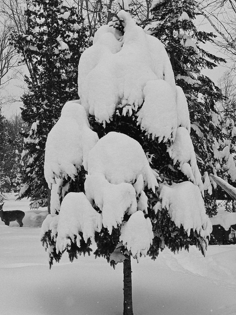 A final treat from winter. Wow. I never get enough of snow-laden balsams, especially next to my porch.