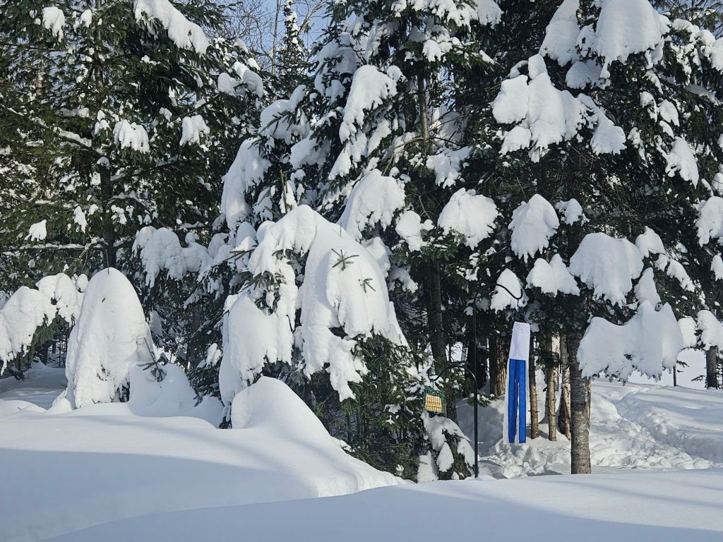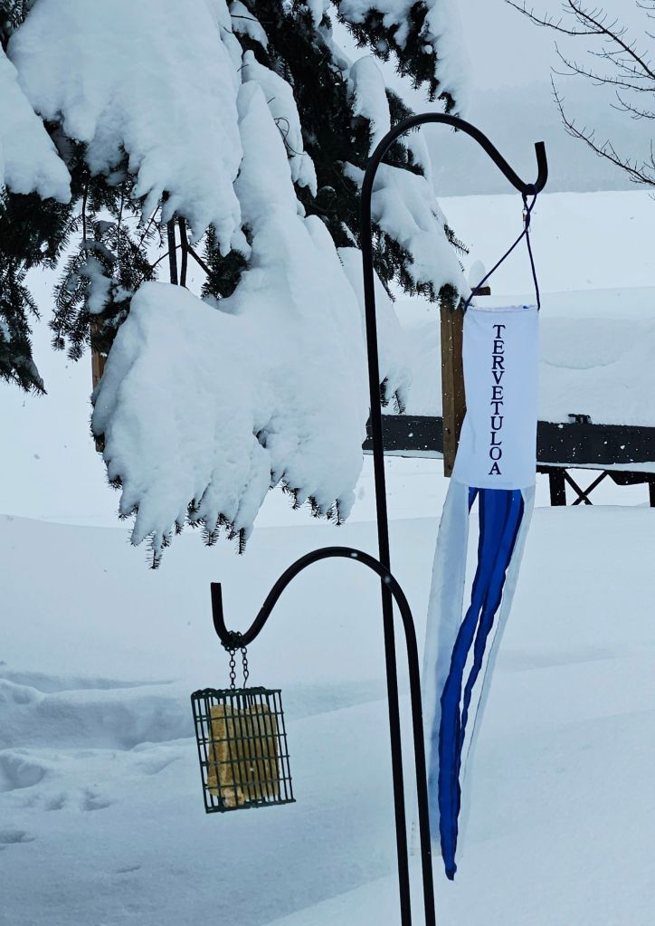 I can’t seem to catch a photo of the little birds who love this suet (black-capped chickadees, red-breasted nuthatches, etc.) because they fly away as soon as I approach, but they’re there a lot. The windsock reads “welcome” in Finnish. Behind it, the snow-covered dock that’s “grounded” on the shoreline for the winter.