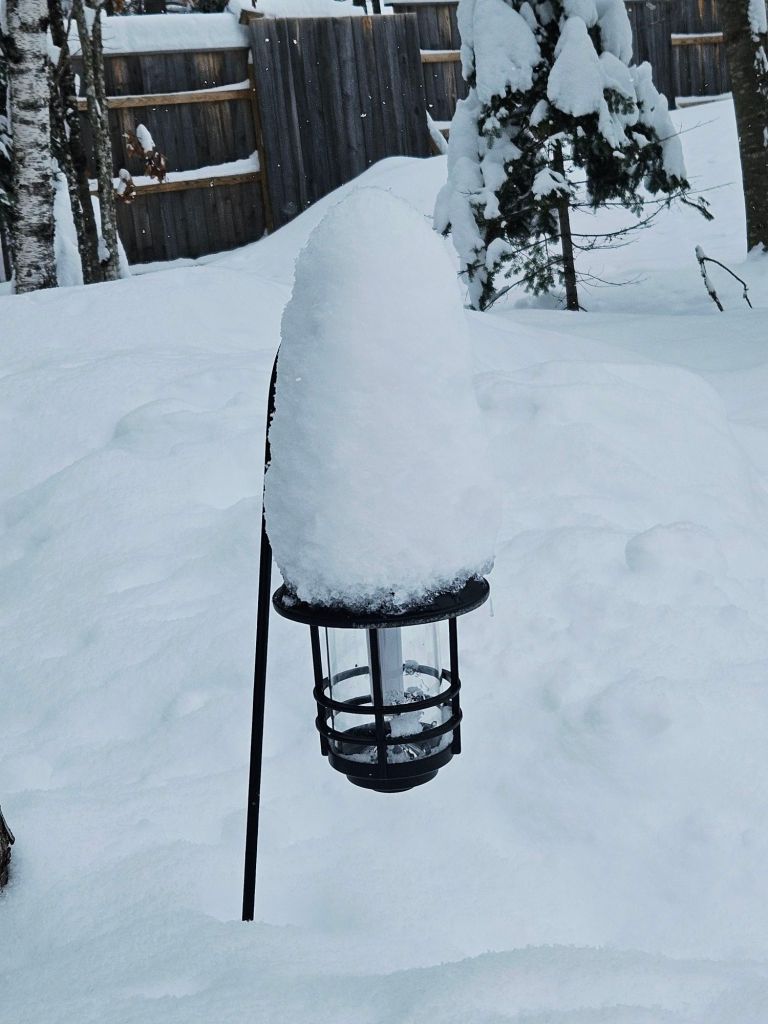 My solar lights don’t get much sun when wearing snow-caps. I put most of them away for the winter but kept a few out because I like to see the glow on the snow at night. Clearly, I need to keep them cleared. 😉