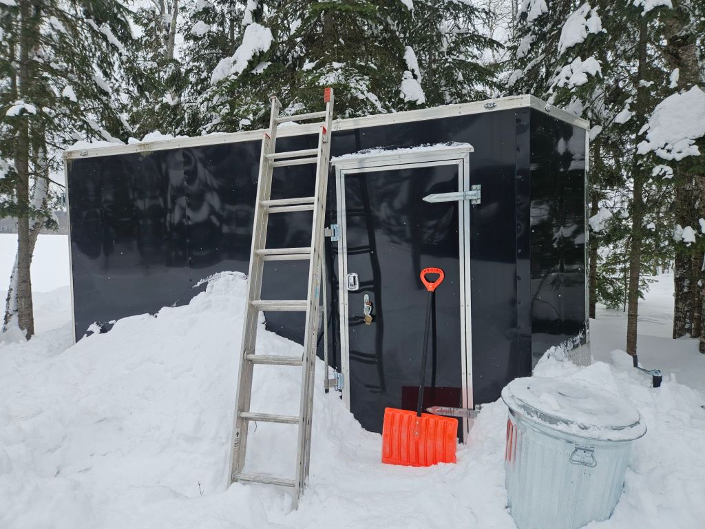 Speaking of shoveling, this — my storage trailer until something better gets built. Jeff says it should be shoveled. The ladders at Camp Many Moons are buried under snow. So I had to borrow a neighbor’s.