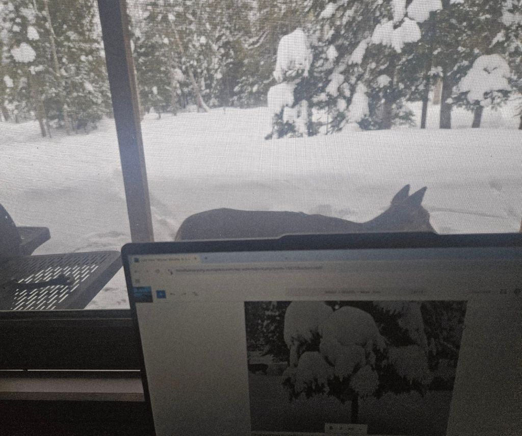 This is the 12-foot trailer that was jokingly dubbed “The Ponderosa,” which I used as a writing studio for years. I’m not bothering to shovel it off because I can’t figure out how. Just walking to it was a challenge. I wore snowshoes, and the snow was so deep that I lost a shoe and had to dig it out. I did check inside for anything I don’t want to lose if the roof caves in. Its structure is already compromised since it’s so old.