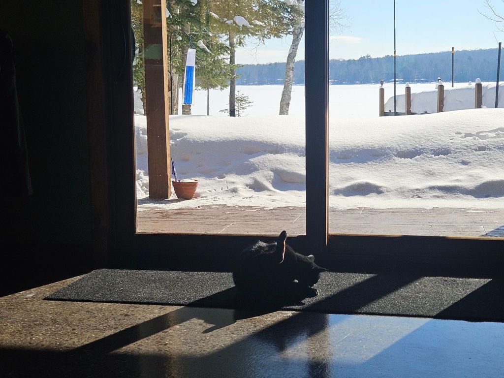 Then there’s the cats – like Boo, basking in the sunbeams. (See the snowbank in front of the door? The ground actually slopes downward there. Strange winds put drifts in strange places this year.) Boo is an indoor/outdoor cat — because she loves to explore, and her quality of life is as important to me as her longevity — but she hadn’t been out much this winter. After 17 years with her, I still don’t understand her behavior. Sometimes she acts like a wild cat. Because those genes are still in her.