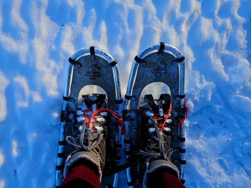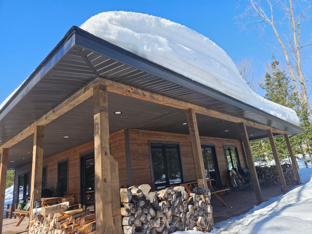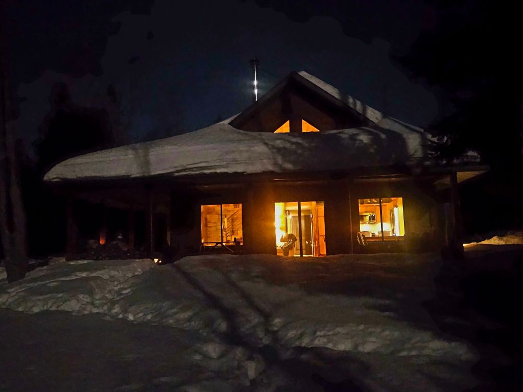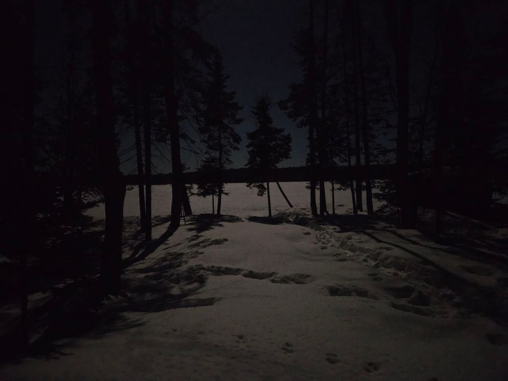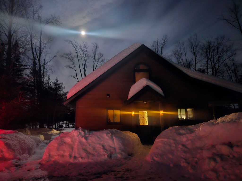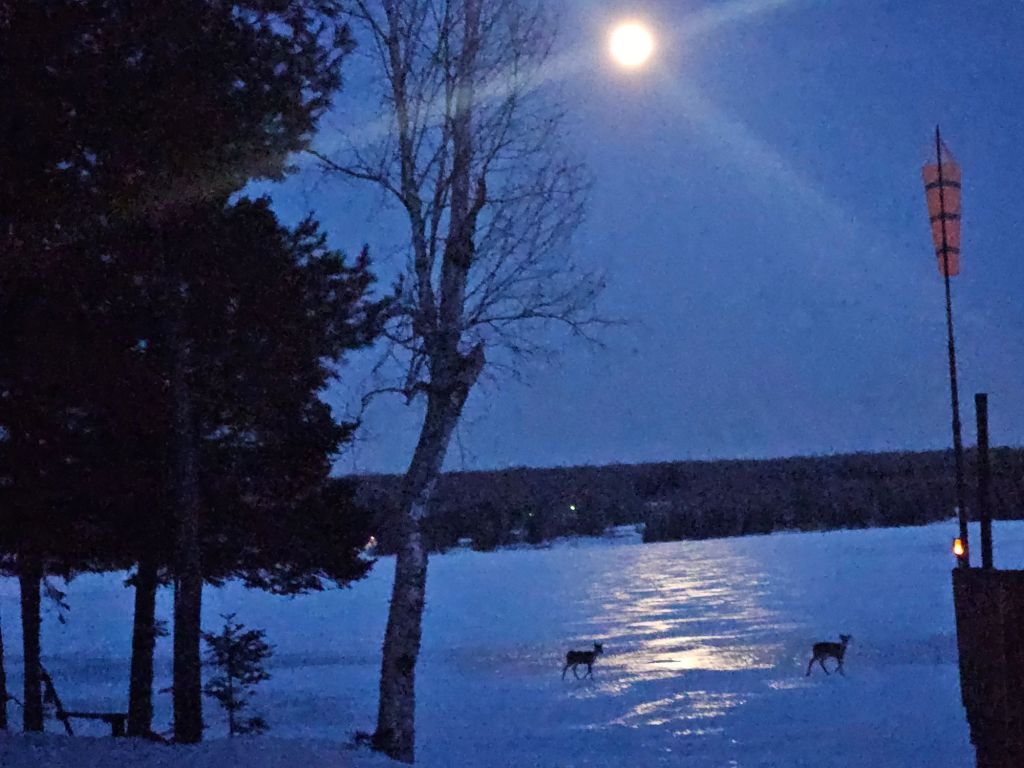 … and snow-shoeing on the rippled ice of the frozen bay in today’s sunshine…… and the deer doing their evening commute on that same frozen bay as tonight’s bright moon rises…… and the water side of the Cabin at Many Moons as the moon throws shadows on the snow…… and the front door as the moon rises over the roof. It’s a cozy place and both Jeff and I are proud of how it turned out.