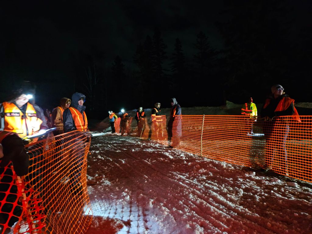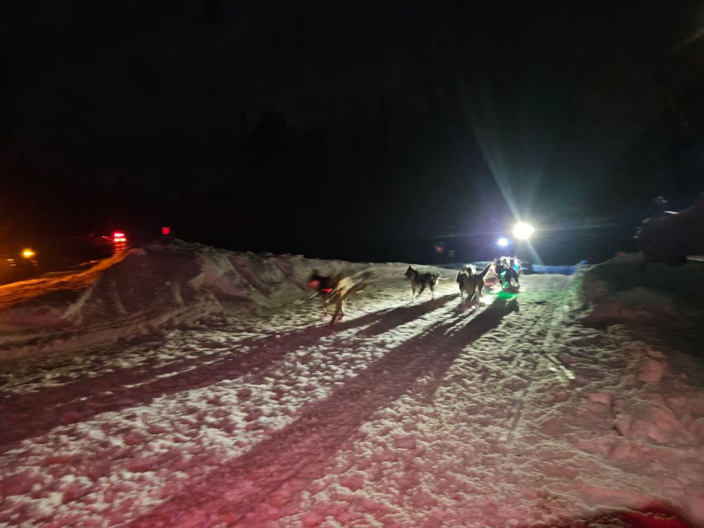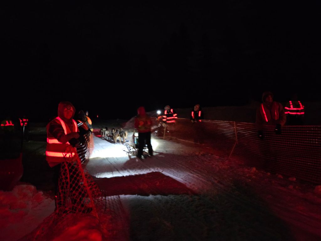 It was a bit nerve-wracking when several sleds came through close together as traffic waited, because it was hard to judge distances in the dark, but it worked. The sled drivers yelled “thank you!” to the volunteers for making sure they were safe.